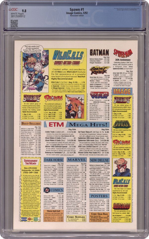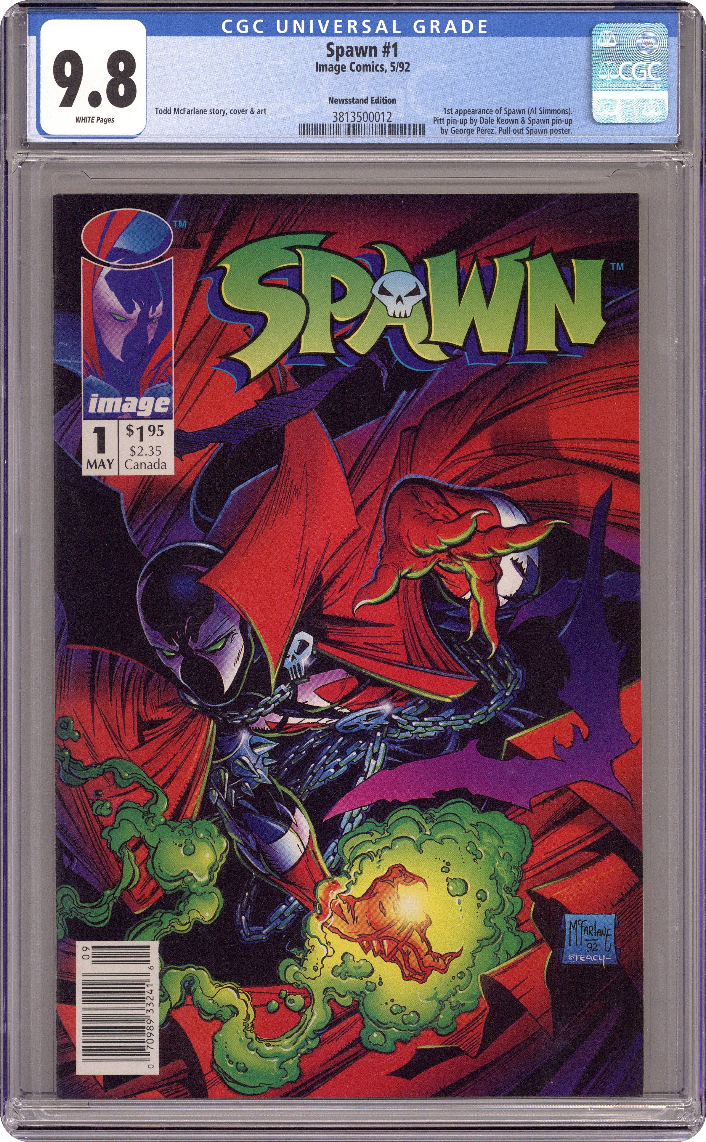 Newsstand edition. "Questions!" Part 1 of 4. Created, story, and art by Todd McFarlane. When government assassin Al Simmons is murdered, a deal with the devil brings him back to the realm of the living. But now he walks the shadows as the disfigured soldier of hell known as Spawn. Armed with unimaginable, but finite, magical abilities, Spawn is destined to play an important role in the upcoming Armageddon. But, what happens when this rebellious anti-hero decides he won't fight for either side? Superstar artist and Image co-founder, Todd McFarlane, creates a character who has gone on to inspire a major motion picture, an HBO animated series, numerous spin-off comic series, and one of the most successful toylines of all time. Spawn centerfold by Todd McFarlane & Ken Steacy. Pin-up of Spawn by George Perez. Pin-up of PITT by Dale Keown. Cover by McFarlane & Steacy. 1st app of Sam and Twitch Cover price $1.95. Grade: CGC 9.8 explanation of grade Condition: Used (collectible)