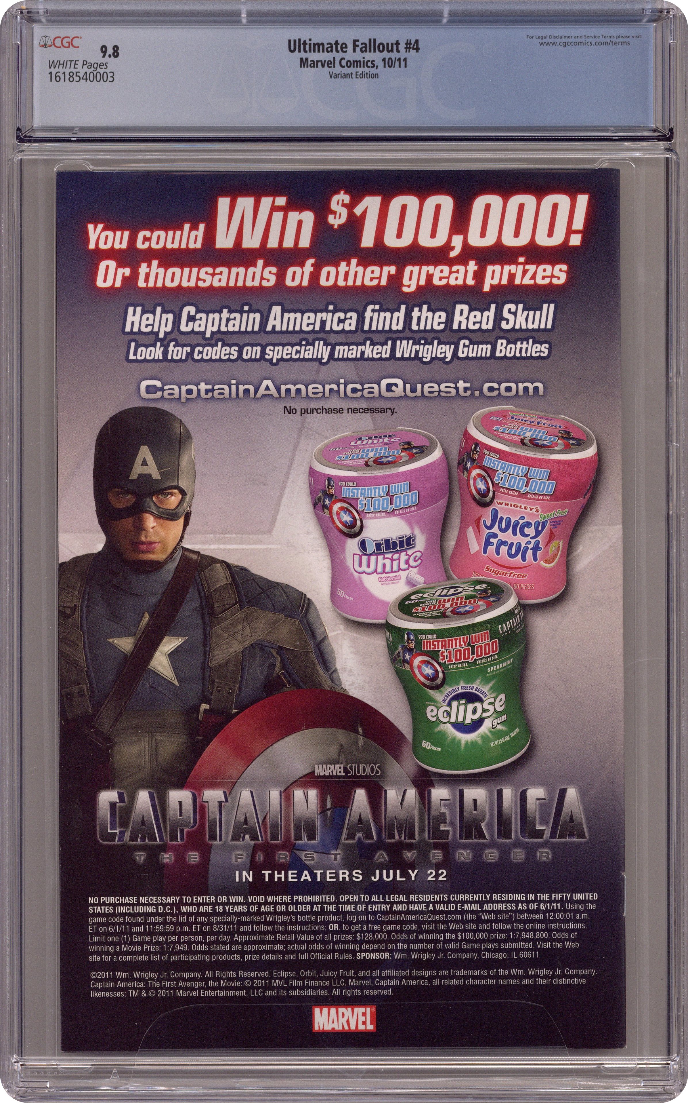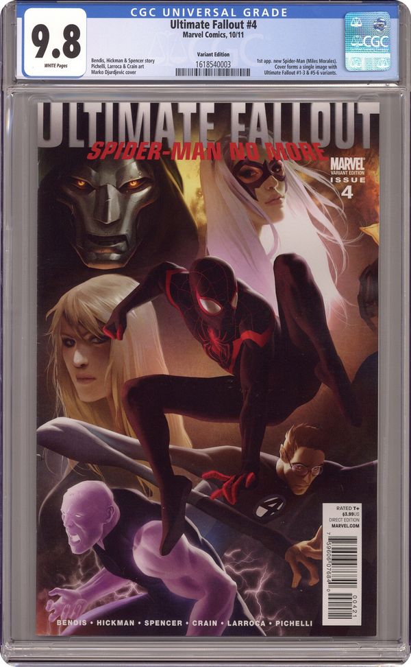 Limited 1 for 25 Variant Cover by Marko Djurdjevic. Written by BRIAN BENDIS, JONATHAN HICKMAN & NICK SPENCER. Art by SARA PICHELLI, SALVADOR LARROCA & CLAYTON CRAIN. What will become of Captain America? Where have all the X-Men gone? And what is up with the new Spider-Man suit? Don't miss the final chapters of one of the most talked about Ultimate events ever. 32 PGS. (each)/Rated T+...$3.99 (each) Cover price $3.99. Grade: CGC 9.8 explanation of grade Condition: Used (collectible)