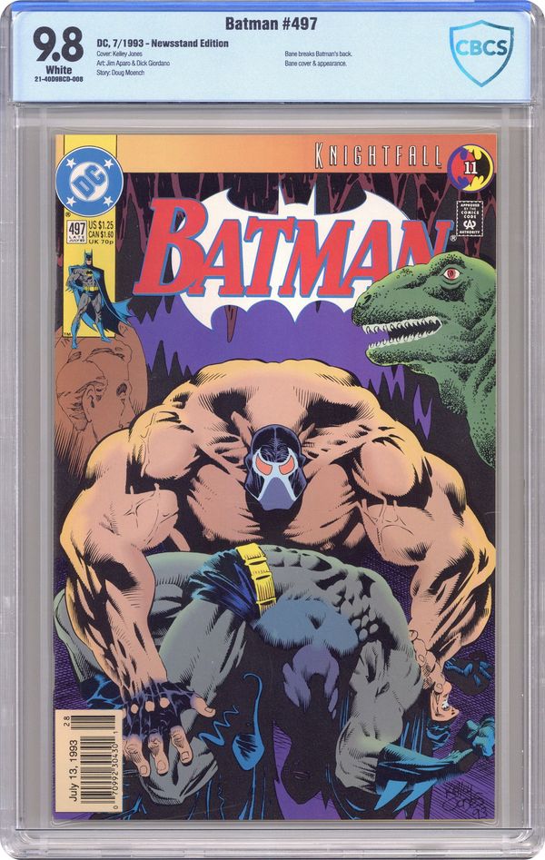 First Printing. Newsstand Edition (does not have an Overlay cover). Bane breaks Batman's back in Batman KnightFall Part 11. Home turf does not prove an advantage when Bane breaks Batman's back in the Batcave in "The Broken Bat." KnightFall continues in Detective Comics (1937- ) #664. Written by Doug Moench. Pencils by Jim Aparo. Inks by Dick Giordano. Cover by Kelley Jones. 36 Pages, Full Color. Cover price $1.25. Grade: CBCS 9.8 explanation of grade Condition: Used (collectible)
