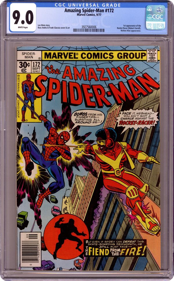 "The Fiend from the Fire!" Part 1 of 2. First appearance of the Rocket Racer. Script by Len Wein. Art by Ross Andru (breakdowns) and Frank Giacoia (finishes). Cover by Ross Andru and Frank Giacoia. The action begins with a bang as the web-slinger chases a new skateboarding super-villain! The Rocket Racer! This red and yellow robber is moving and grooving through the streets on his souped-up skateboard! But the Spectacular Spider-Man is waiting right around the corner to teach him a lesson in driver etiquette! Meanwhile the police arrest Liz Allan for stealing drugs and chemicals from a local hospital! Why would Liz do that? Maybe she did it for a man! Or perhaps more specifically the Molten Man! Cameo appearances by Harry Osborn, J. Jonah Jameson, and Dr. Marla Madison. (Notes: The Rocket Racer appears next in Amazing Spider-Man 182. The Molten Man previously battled the web-slinger in Amazing Spider-Man 133. A limited distribution 35-cent cover price variant exists for this issue. 36 pages Cover price $0.30. Grade: CGC 9.0 explanation of grade Condition: Used (collectible)