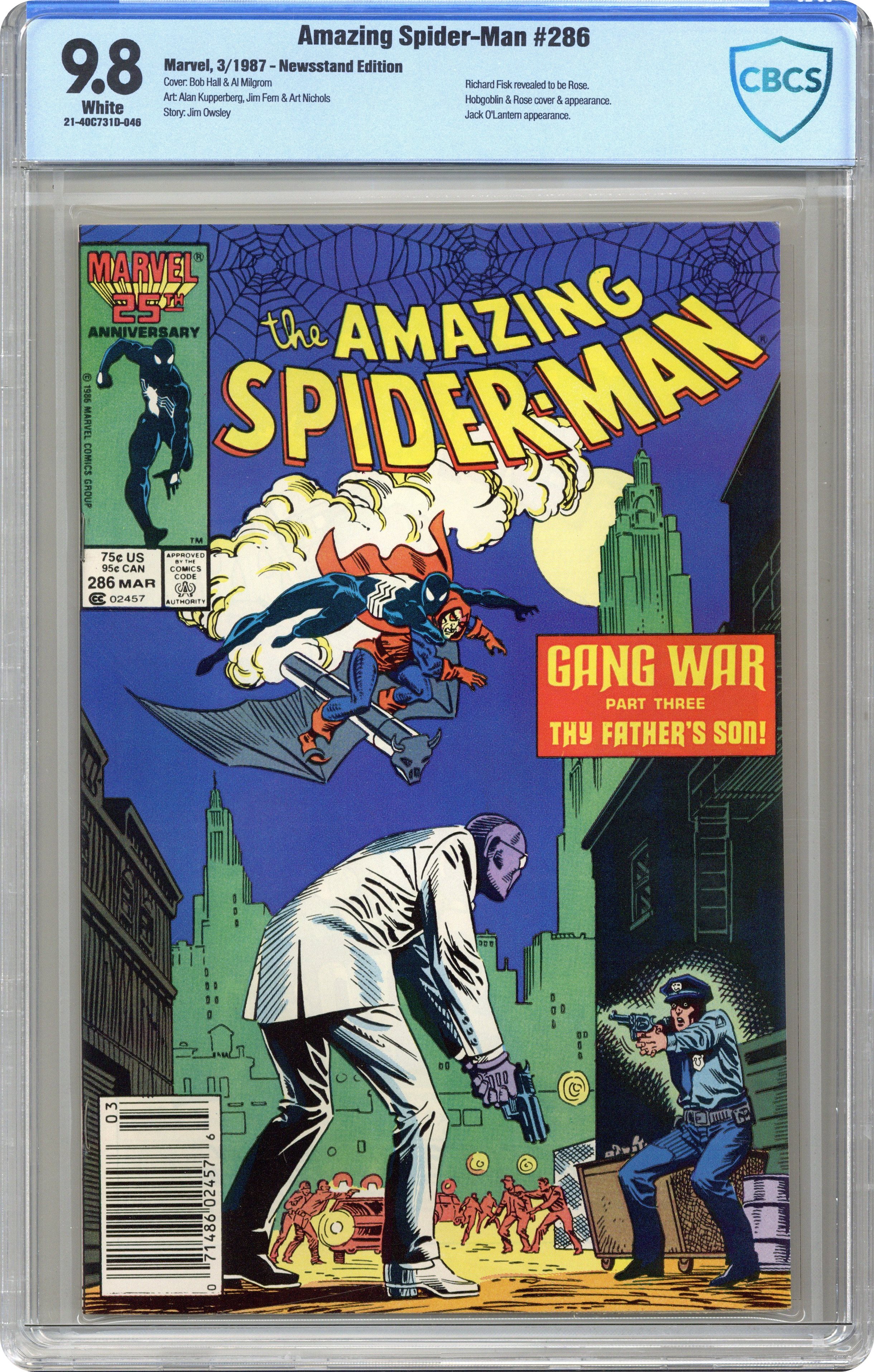 Direct Edition. Gang War: Part 3 of 5 -- "Thy Father's Son!" Script by Jim Owsley. Pencils by Alan Kupperberg. Inks by Jim Fern and Art Nichols. Cover by Bob Hall and Al Milgrom. New York City is on fire! Specifically in Jackson Heights where a meeting between the Rose and the Blue Boys has turned into a disaster! And the situation on the ground is suddenly every man for himself! The Rose, Hobgoblin, and Jack O'Lantern try to escape the fiery chaos while New York's finest and the wall-crawler attempt to restore order! Both Spider-Man and the Rose have the power of life and death in their hands! One will choose life. The other will not. A powerful story! Appearances by Mary Jane Watson, Sergeant Tork, and Lance Bannon. Cameo appearances by Aunt May and Vanessa Fisk. (Note: This issue features a full-page ad for the Fallen Angels (1987) Limited Series with art by Kerry Gammill and Tom Palmer.) 36 pages. Cover price $0.75. Grade: CBCS 9.8 explanation of grade Condition: Used (collectible)