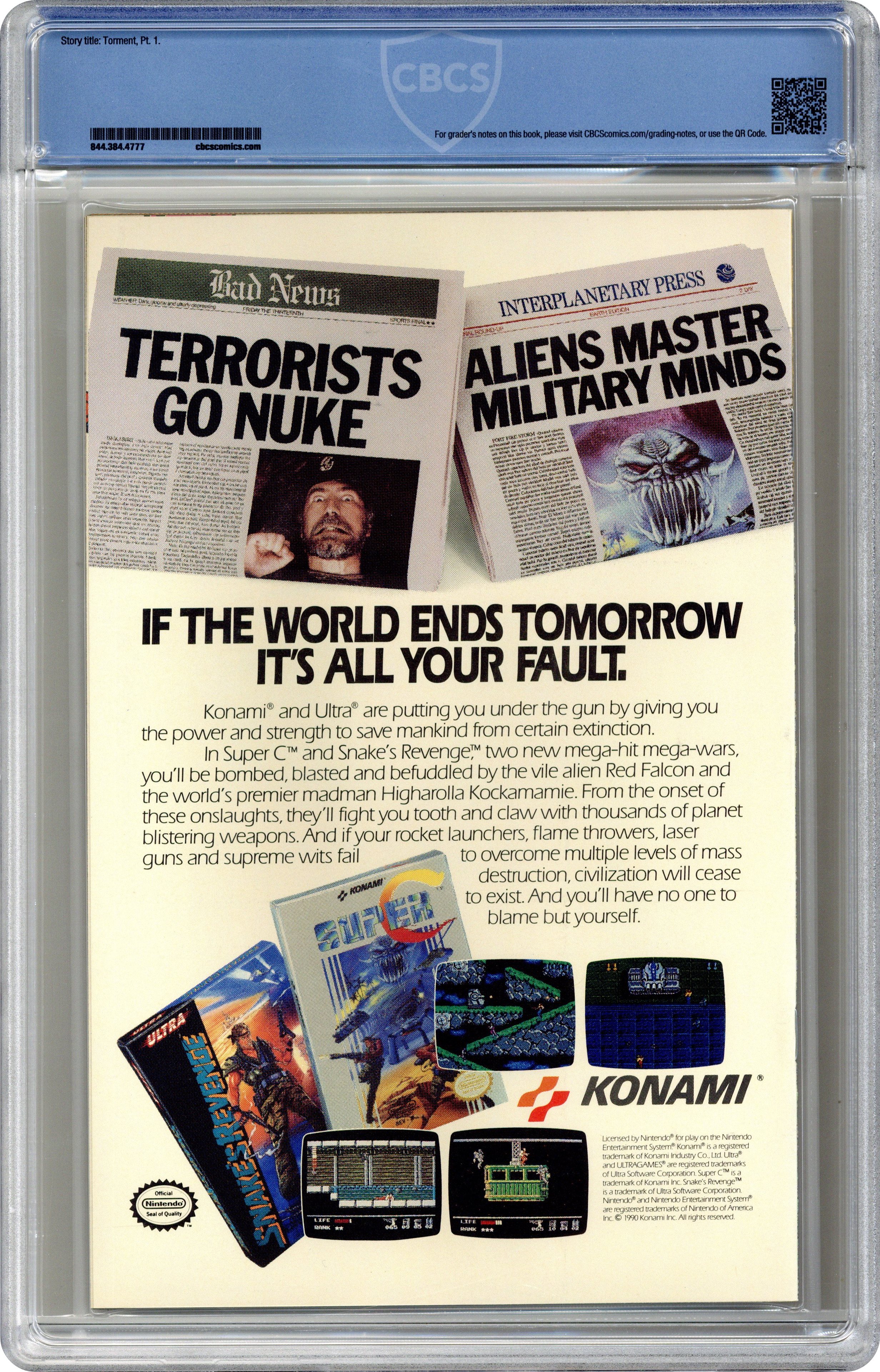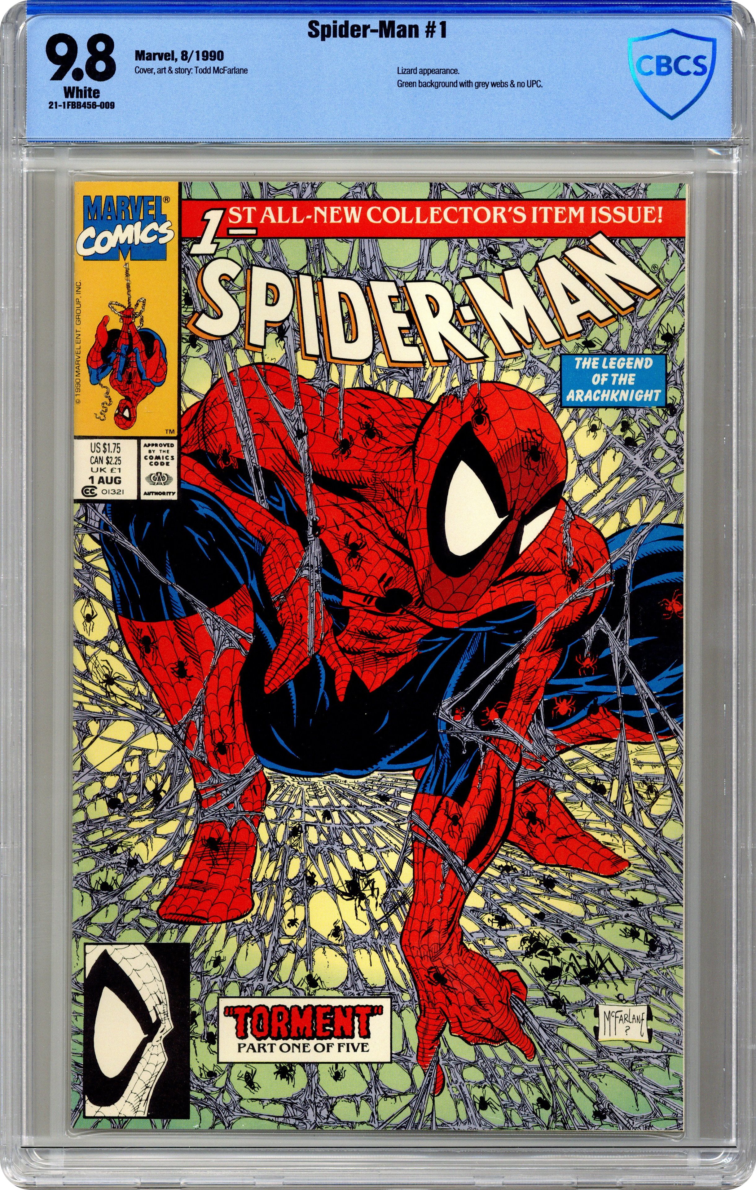 Unbagged Direct Edition - Torment Part 1 of 5. "Torment" Script and art by Todd McFarlane. Cover by Todd McFarlane. Fresh off his legendary run on the Amazing Spider-Man series, superstar artist Todd McFarlane takes the reins of his own Spider-title! Right off the bat the breathtaking action begins as mysterious and ominous drums awaken the Lethal Lizard! And send the reptilian creature on a path of death and destruction thru New York City! Spider-Man's nightmare is just starting! Appearance by Mary Jane Watson. (Notes: Spider-Man #1 was one of the first Marvel issues to feature numerous variant covers. The Spider-Man (1990) series became the fourth monthly title for the web-slinger. This issue was published the same month as Amazing Spider-Man 337. The letters page features an essay by Todd McFarlane. The webbing on the cover may be gray or purple.) 32 pages. Cover price $1.75. Grade: CBCS 9.8 explanation of grade Condition: Used (collectible)