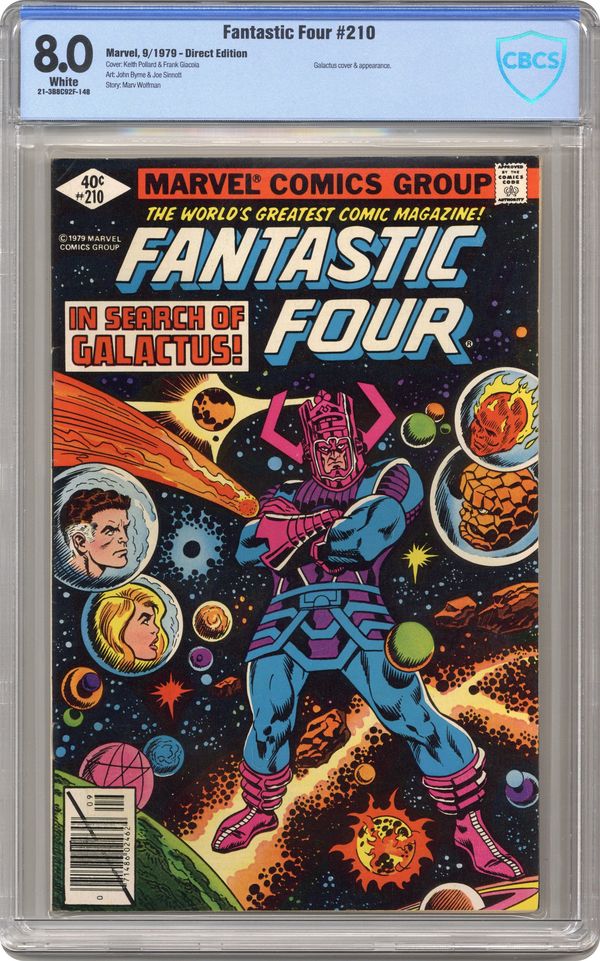 Direct Edition. "In Search of Galactus" Written by Marv Wolfman. Pencils by John Byrne. Inks by Joe Sinnott. Cover by Keith Pollard and Frank Giacoia. The Fantastic Four locate Galactus' ship and confront the Devourer of Worlds inside! Galactus is open to the possibility of coming to Earth to battle the Sphinx, but the FF must do him a favor first...find his next herald! Note: The FF's preceding encounter with Galactus was in Fantastic Four 175. Cover price $0.40. Grade: CBCS 8.0 explanation of grade Condition: Used (collectible)