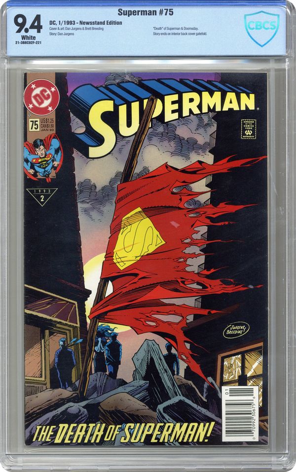 1st printing. Doomsday! Part 7 of 7. "Doomsday!" Story by Dan Jurgens. Art by Dan Jurgens and Brett Breeding. Here it is, the issue that rocked the DC Universe. An unstoppable force named Doomsday crash landed on Earth and has cut a swath of death and destruction across the country, all the way to Metropolis. Even the Justice League, the world's premiere super-team, was powerless before this creature's might. Now one man stands defiantly in Doomsday's way and vows that the creature's insanity stops here. Superman fights his strongest opponent to the death in the streets of Metropolis. NOTE: The event of "The Death of Superman" was so huge that it was reported on by the national media. - Odinson, Lonestar Comics Archivist Cover price $1.25. Grade: CBCS 9.4 explanation of grade Condition: Used (collectible)