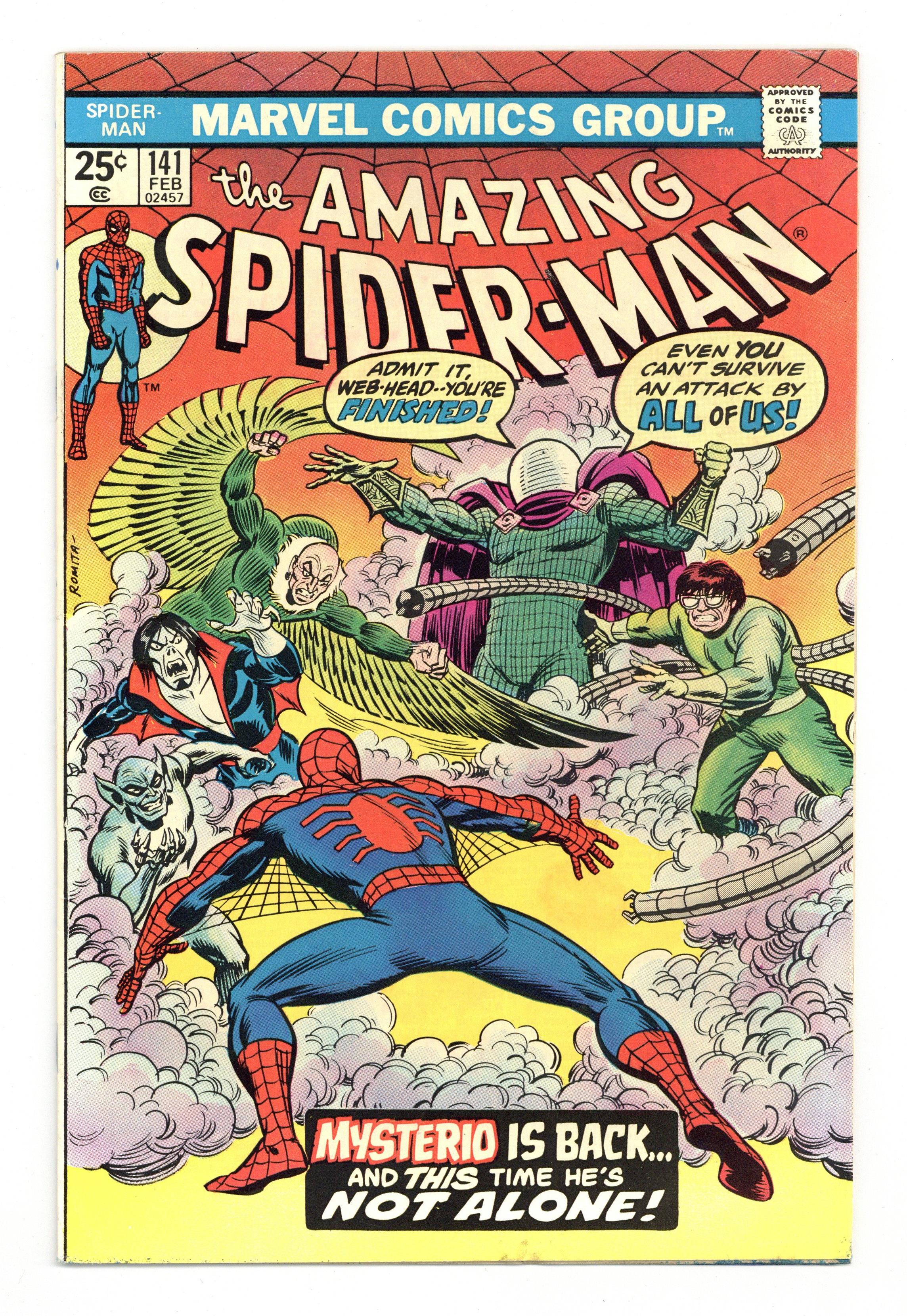 First appearance of the second Mysterio (aka Danny Berkhart) in "The Man's Name Appears to Be...Mysterio!" Part 1 of 2. Script by Gerry Conway. Pencils by Ross Andru. Inks by Frank Giacoia and Dave Hunt (backgrounds). Cover by John Romita. The Amazing Spider-Man decides to take the Spider-Mobile for a spin! But after evading New York's Finest, he accidentally crashes into the Hudson River! Scratch one Spider-Mobile! The mist and fog tricked the web-slinger! The next day when the wall-crawler sees apparitions on his deadly foes including the Green Goblin, Dr. Octopus, and the Molten Man; he realizes that the Master of Illusion has returned! Can Spider-Man stop the madness...before he goes mad himself? Cameo appearances by Mary Jane Watson, Betty Brant, Ned Leeds, Joe Robertson, J. Jonah Jameson, and Professor Miles Warren. (Notes: The web-slinger previously battled the original Mysterio in Amazing Spider-Man 67. The letters page includes Marvel Value Stamp series A #35 Killraven by Herb Trimpe and Frank Giacoia. This story was reprinted in Marvel Tales 118.) 36 pages. 25c cover price. Cover price $0.25. Grade: VG/FN 5.0 explanation of grade Condition: Used (collectible)