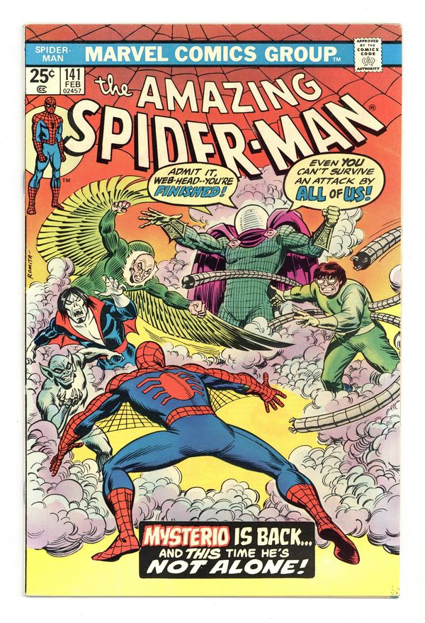 First appearance of the second Mysterio (aka Danny Berkhart) in "The Man's Name Appears to Be...Mysterio!" Part 1 of 2. Script by Gerry Conway. Pencils by Ross Andru. Inks by Frank Giacoia and Dave Hunt (backgrounds). Cover by John Romita. The Amazing Spider-Man decides to take the Spider-Mobile for a spin! But after evading New York's Finest, he accidentally crashes into the Hudson River! Scratch one Spider-Mobile! The mist and fog tricked the web-slinger! The next day when the wall-crawler sees apparitions on his deadly foes including the Green Goblin, Dr. Octopus, and the Molten Man; he realizes that the Master of Illusion has returned! Can Spider-Man stop the madness...before he goes mad himself? Cameo appearances by Mary Jane Watson, Betty Brant, Ned Leeds, Joe Robertson, J. Jonah Jameson, and Professor Miles Warren. (Notes: The web-slinger previously battled the original Mysterio in Amazing Spider-Man 67. The letters page includes Marvel Value Stamp series A #35 Killraven by Herb Trimpe and Frank Giacoia. This story was reprinted in Marvel Tales 118.) 36 pages. 25c cover price. Cover price $0.25. Grade: VG/FN 5.0 explanation of grade Condition: Used (collectible)