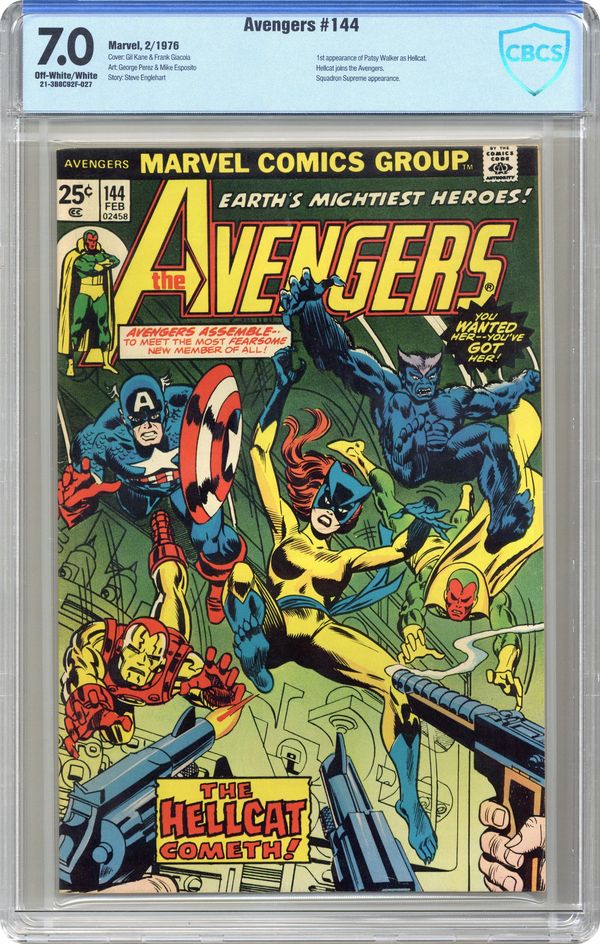 "Claws!" Part 4 of 7. First appearance of Hellcat. Script by Steve Englehart. Pencils by George Perez. Inks by Mike Esposito. Cover by Gil Kane and Frank Giacoia. The Avengers are free inside the Brand Corporation's Long Island facility! However, it doesn't take long for Hugh Jones and Buzz Baxter to locate them and activate the plant's internal military-grade weapons! During the missile attack, the Avengers are forced to split up. The Beast, Vision, and Scarlet Witch go one way...and Captain America, Iron Man, and Patsy Walker go another! When Shell-head comes across the former uniform of the Cat, the shield-slinger gets an idea! And in a dazzling transformation...Patsy Walker becomes Hellcat! The Avengers could use another hero on their side, because the rematch with Doctor Spectrum, the Golden Archer, Hyperion, Lady Lark, and the Whizzer is coming up fast! An excellent issue! The story (part 5) continues in Avengers 147. Origin of Patsy Walker. Cameo appearances by the Two-Gun Kid, Hawkeye, Moondragon, and Thor. Flashback cameos by the Fantastic Four, Spider-Man, and Tigra. (Notes: The letters page includes letters from comics writer Peter Gillis and comics writer Mary Jo Duffy, respectively. The letters page also contains Marvel Value Stamp Series B #39 Thor by Jack Kirby.) 36 pgs. Cover price $0.25. Grade: CBCS 7.0 explanation of grade Condition: Used (collectible)