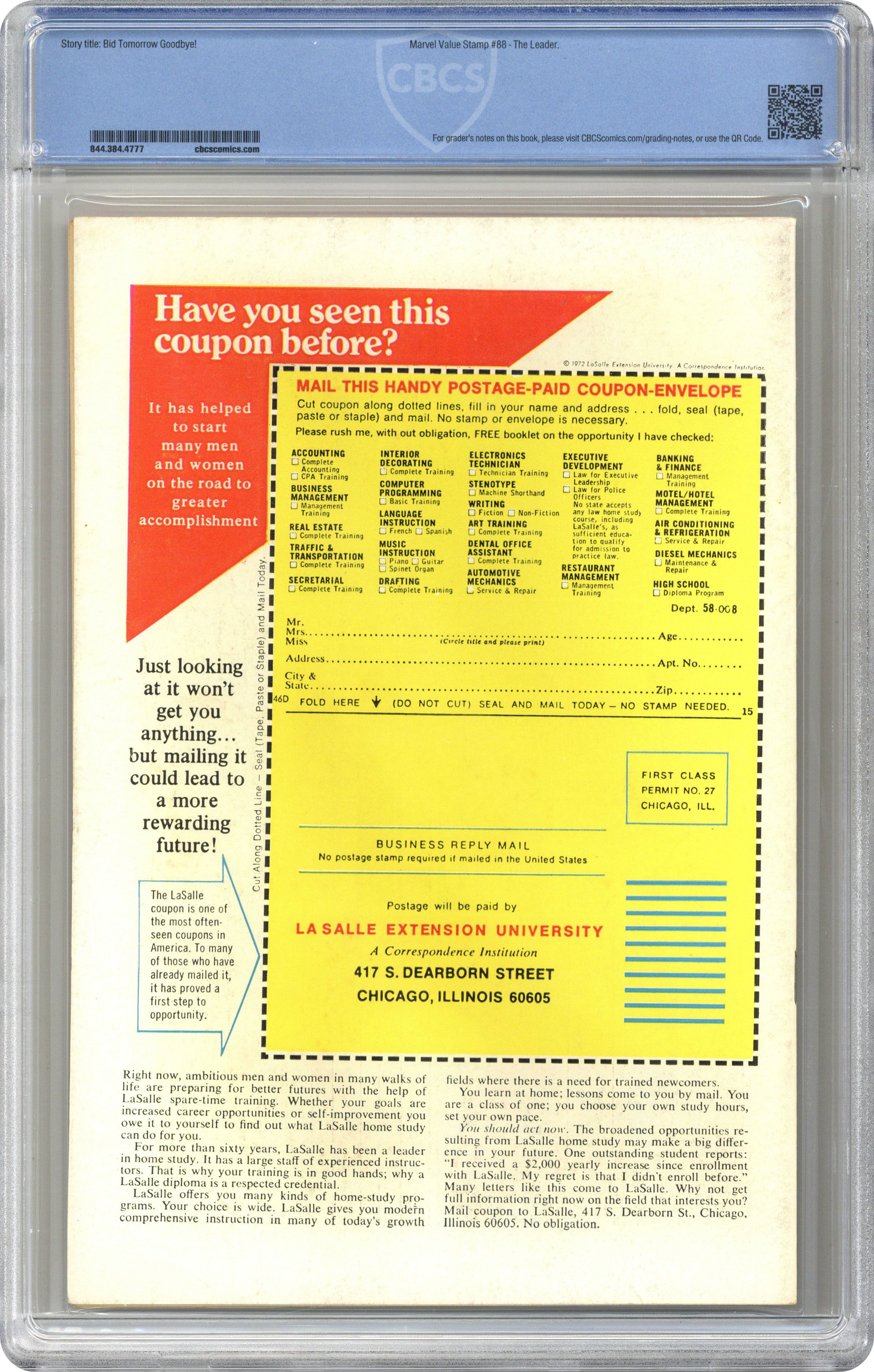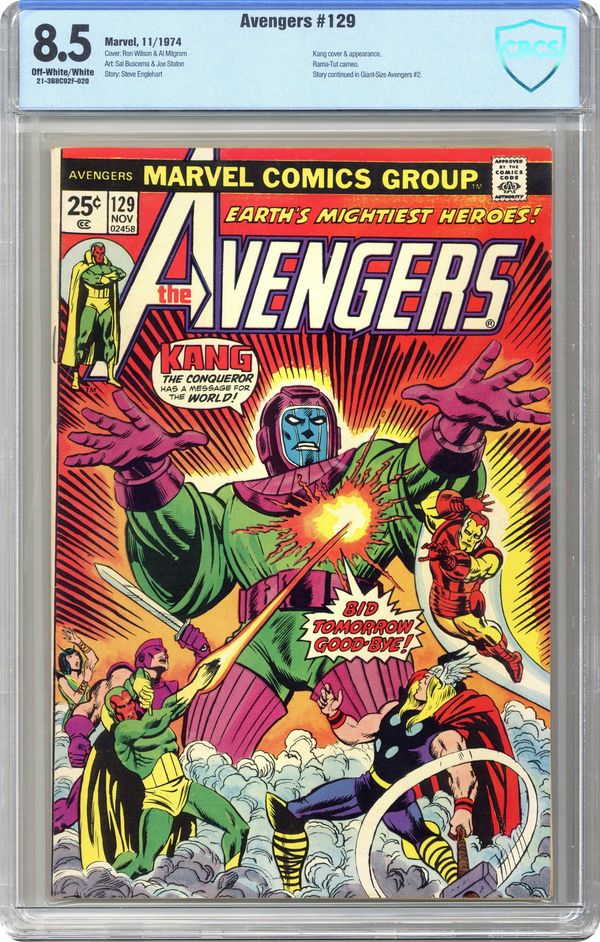 "Bid Tomorrow Goodbye!" Script by Steve Englehart. Art by Sal Buscema (breakdowns) and Joe Staton (finishes). Cover by Ron Wilson and Mike Esposito. A bright shining star appears over Avengers Mansion! What does the radiant beacon foretell? Kang the Conqueror thinks he knows! And thus begins the Celestial Madonna saga! The 41st century Master of Time and his macrobots attack the Avengers outside their mansion! After overwhelming the six avengers, Kang absconds with five of them plus Agatha Harkness! The Conqueror deems the Swordsman as unworthy and leaves him behind. Will Kang end up regretting that decision? The former sword-wielding super-villain certainly has his work cut out for him! However, the Swordsman catches a big break when Agatha Harkness telepathically reveals Kang's hideaway! The centuries-old pyramids of Egypt! After arriving in the Egyptian desert, the Swordsman desperately needs an ally! Could one of the ancient pharaohs still be lurking around to help? Story continues in Giant-Size Avengers 2. Cameo appearance by Rama-Tut. Avengers Lineup: Iron Man, Mantis, Scarlet Witch, Swordsman, Thor, and the Vision. (Notes: The classic Celestial Madonna storyline runs through Avengers 129-135 and Giant-Size Avengers 2-4. Kang previously battled Earth's Mightiest Heroes in Avengers (1st series) 71. The letters page contains Marvel Value Stamp Series A #88 The Leader.) 36 pages Cover price $0.25. Grade: CBCS 8.5 explanation of grade Condition: Used (collectible)