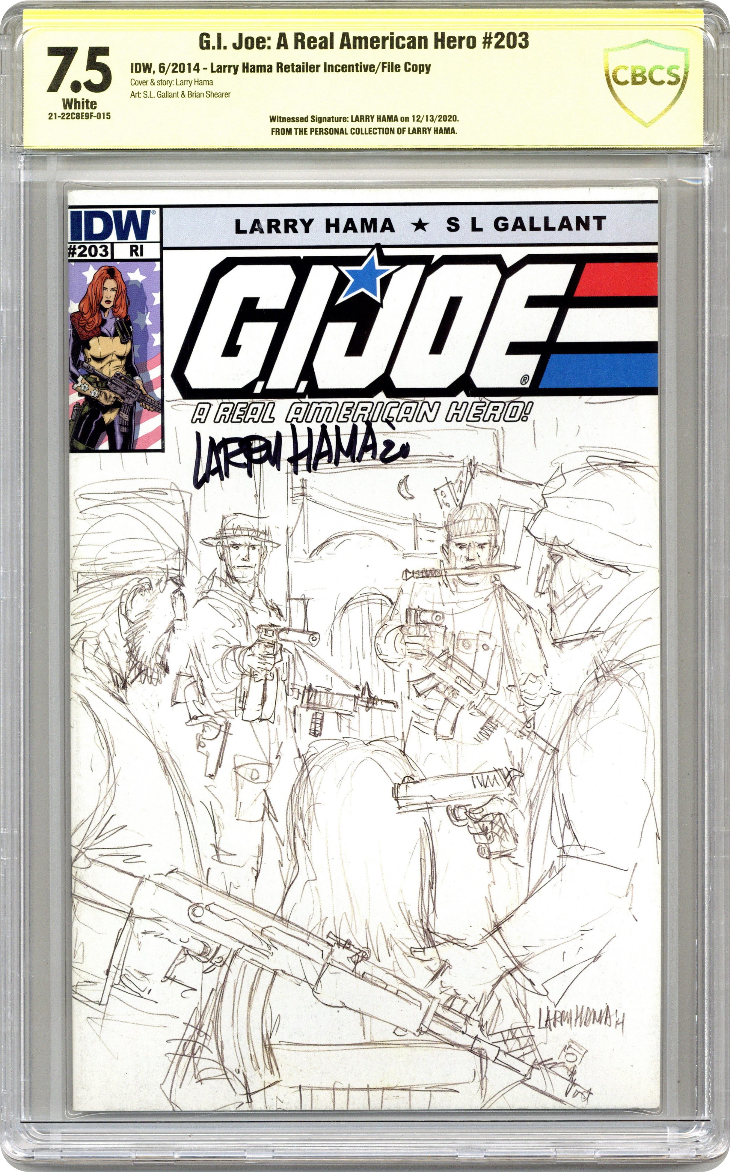 Limited 1 for 10 Retailer Incentive Variant Cover by Larry Hama. Written by Larry Hama. Art by S. L. Gallant. While G.I. JOE continues to adjust to their new circumstances, COBRA COMMANDER begins making his play to unite COBRA. However, his serpentine plot has many twists and turns, and with ZARTAN, DESTRO and BARONESS in the mix, the results may be unexpected-and dangerous! All the pieces fall into place in G.I. Joe: A Real American Hero #203! 28 pages, full color. Cover price $3.99. Grade: CBCS 7.5 explanation of grade Condition: Used (collectible)
