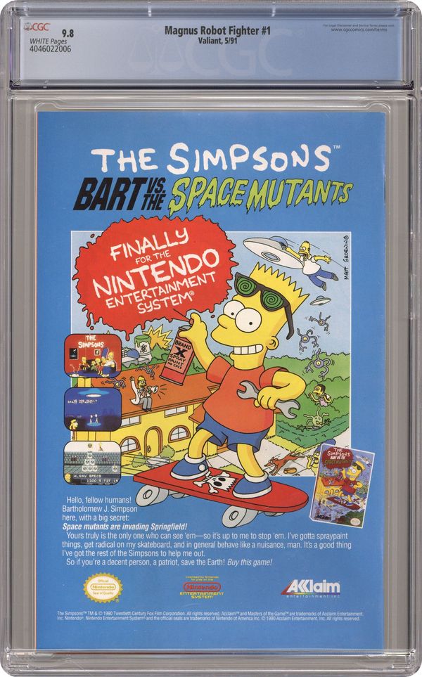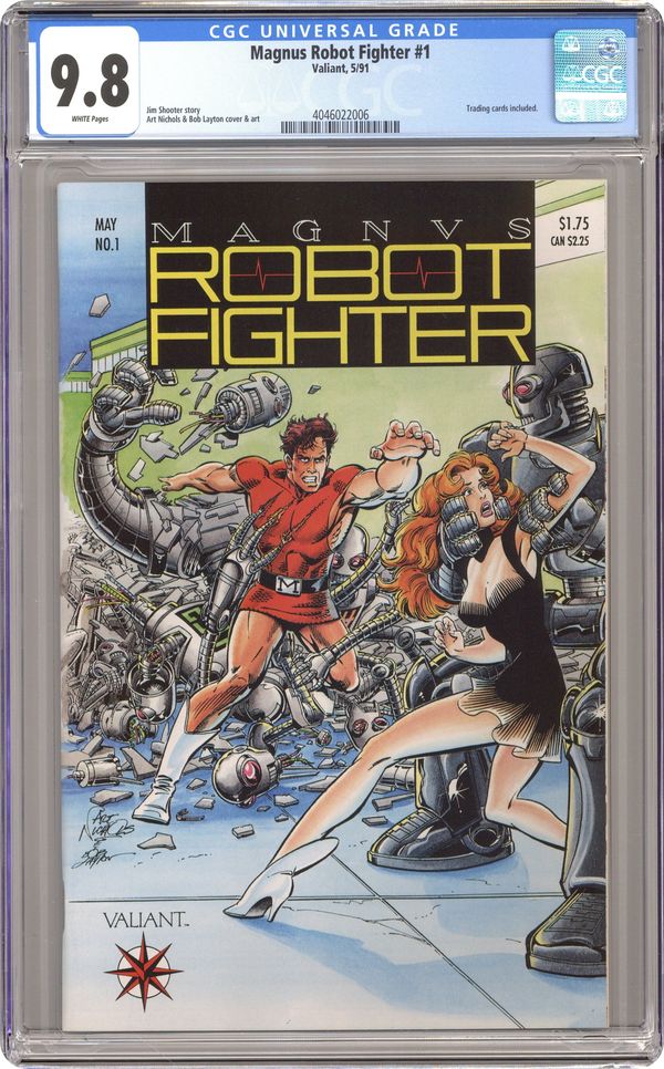 Trading Card insert in centerfold. Coupon is on the back of the trading cards, not separate! Freewill robots learn that there are others like them and start communicating with each other and try to organize and Magnus wonders whether these freewill robots are truly alive and not merely machines in "Steel Nation Part One -- Protector." Story also includes the origin of 1-A. Script by Jim Shooter and art by Art Nichols & Bob Layton & Kathryn Bolinger. Cover price $1.75. Grade: CGC 9.8 explanation of grade Condition: Used (collectible)