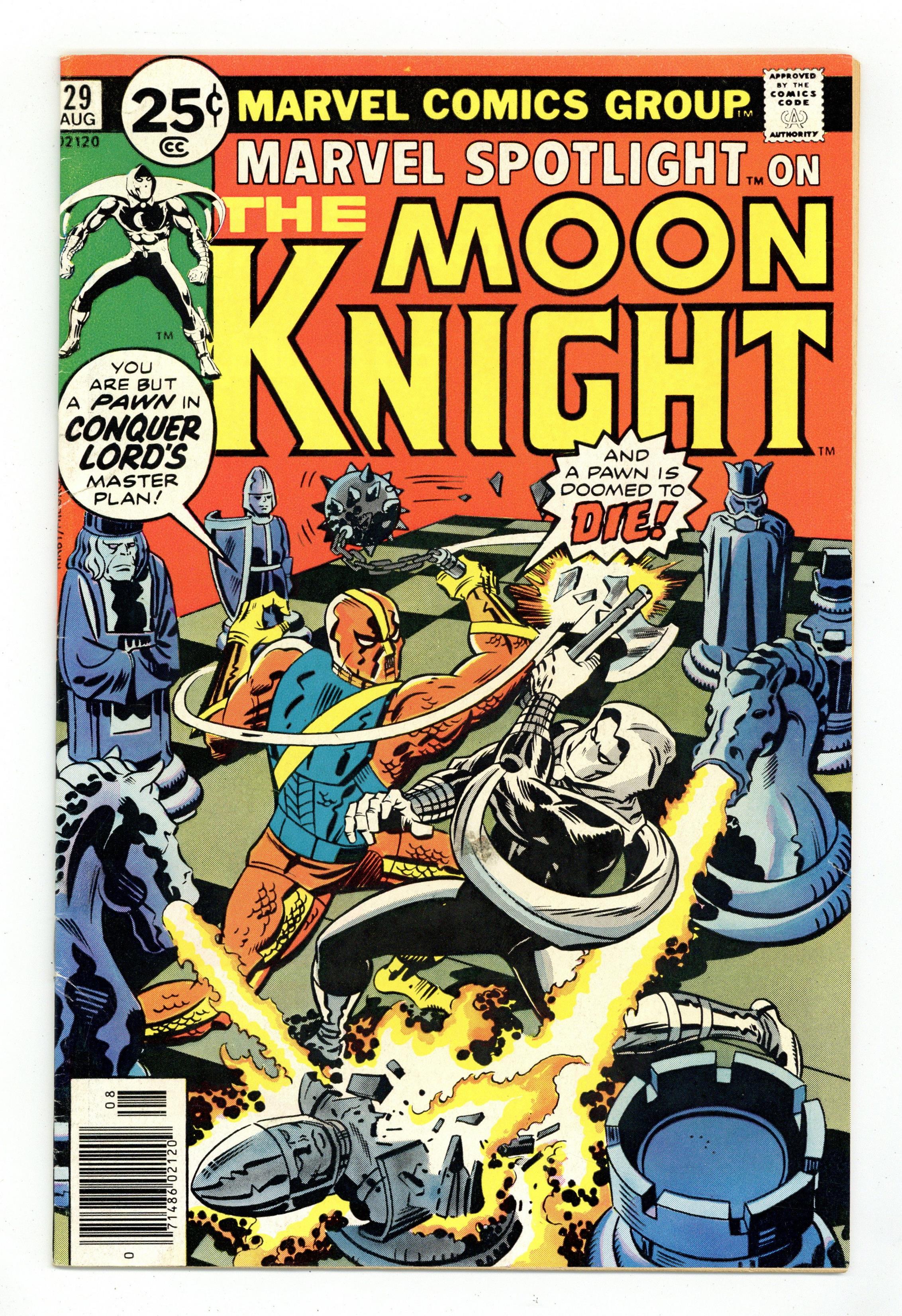 Ended Dec 14 2023 Winning Bid $13 Cover pencils by Jack Kirby, inks by Al Milgrom. The Deadly Gambit of Conquer-Lord!, script by Doug Moench, art by Don Perlin; Moon Knight stops Conquer-Lord from assassinating the mayor; Conquer-Lord escapes with Marlene as his hostage; Moon Knight goes after him 36 pages, full color. Cover price $0.25. Grade: VG 4.0 explanation of grade Condition: Used (collectible)