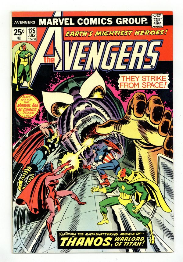"The Power of Babel!" Guest-starring Captain Marvel. Script by Steve Englehart. Art by John Buscema (breakdowns) and Dave Cockrum (finishes). Cover by Ron Wilson and John Romita. Story continues from Captain Marvel 32. Captain America returns to the Avengers just in time for an out-of-this-world adventure! Earth's Mightiest Heroes blast off into outer space to intercept Thanos' awesome armada headed towards Earth! The Avengers attack the alien starships and inflict heavy damage until they bump into a solid black force field! What's hiding behind the imposing barrier? The Vision, Scarlet Witch, Swordsman, and Mantis penetrate the force field and discover the mad Titan's massive command ship! And hordes of aliens inside! But these are four mighty avengers! With skill and teamwork, they disable the ship's universal translator and throw the entire attack fleet into chaos! Have the Avengers finally derailed Thanos' plan for conquest of the cosmos? Story concludes in Captain Marvel 33. Cameo appearances by Libra, Lou-Ann, Thanos, and the Skrulls. Avengers Lineup: Black Panther, Captain America, Iron Man, Mantis, Scarlet Witch, Swordsman, Thor, and the Vision. (Note: The letters page contains Marvel Value Stamp Series A #69 Marvel Girl.) 36 pages Cover price $0.25. Grade: FN+ 6.5 explanation of grade Condition: Used (collectible)