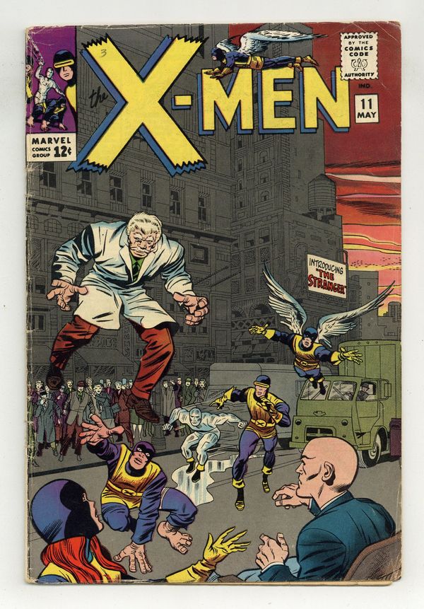 First appearance of the Stranger. Cover pencils by Jack Kirby, inks by Chic Stone. The Triumph of Magneto!, script by Stan Lee, pencils by Jack Kirby, inks by Chic Stone; Xavier detects an exteremely powerful entity that has arrived on earth and sends the X-Men to investigate; The Stranger tries to acclimate himself to earth customs but runs across Magneto and the Brotherhood; The X-Men arrive on the scene and battle the Brotherhood but the Stranger leaves with Magneto and Toad in the conflict; Without a leader, Quicksilver and the Scarlet Witch decide to return home to Central Europe; The X-Men encounter the Stranger once again and Xavier realizes he is an alien; The Stranger explains that he has been collecting mutants from across the universe and takes Magneto and Toad away with him into space. 36 pgs. $0.12. Cover price $0.12. Grade: VG- 3.5 explanation of grade Condition: Used (collectible)