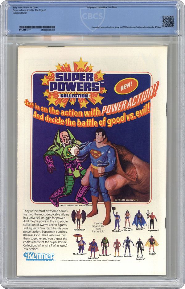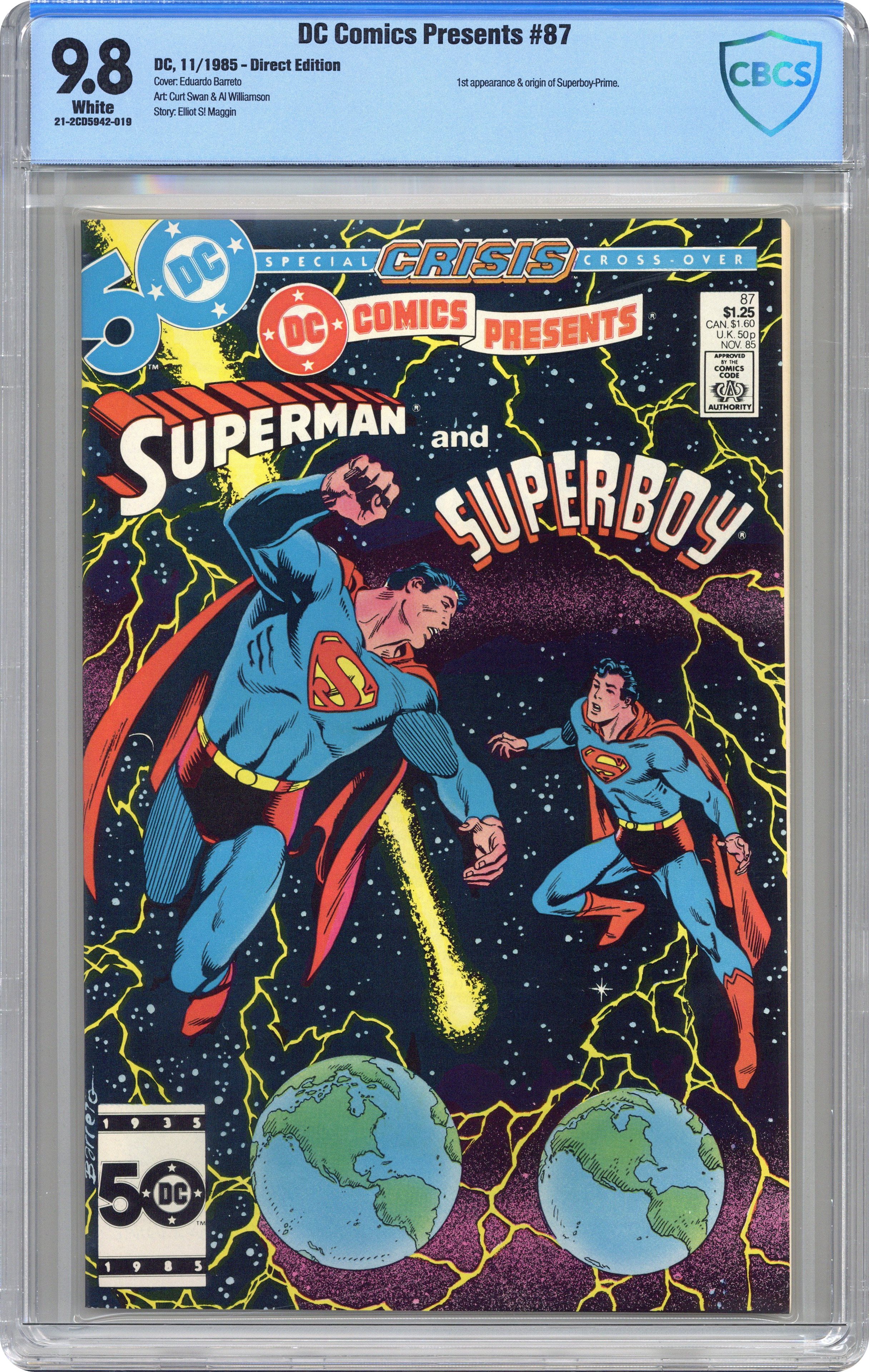 Ended Feb 3 2024 Winning Bid $100 Direct Edition. Crisis on Infinite Earths cross-over. Zapped by an alien ray, Superman hops dimensions and teams up with Superboy-Prime to battle Polarians on Earth-Prime in the 24-page "Year of the Comet." Continued in Adventures of Superman (1939) #414. Script by Elliot S! Maggin, art by Curt Swan & Al Williamson. Plus: the 16-page "Origin of Superboy-Prime" by Maggin, Swan & Williamson. Cover by Eduardo Barreto. Cover price $1.25. Grade: CBCS 9.8 explanation of grade Condition: Used (collectible)