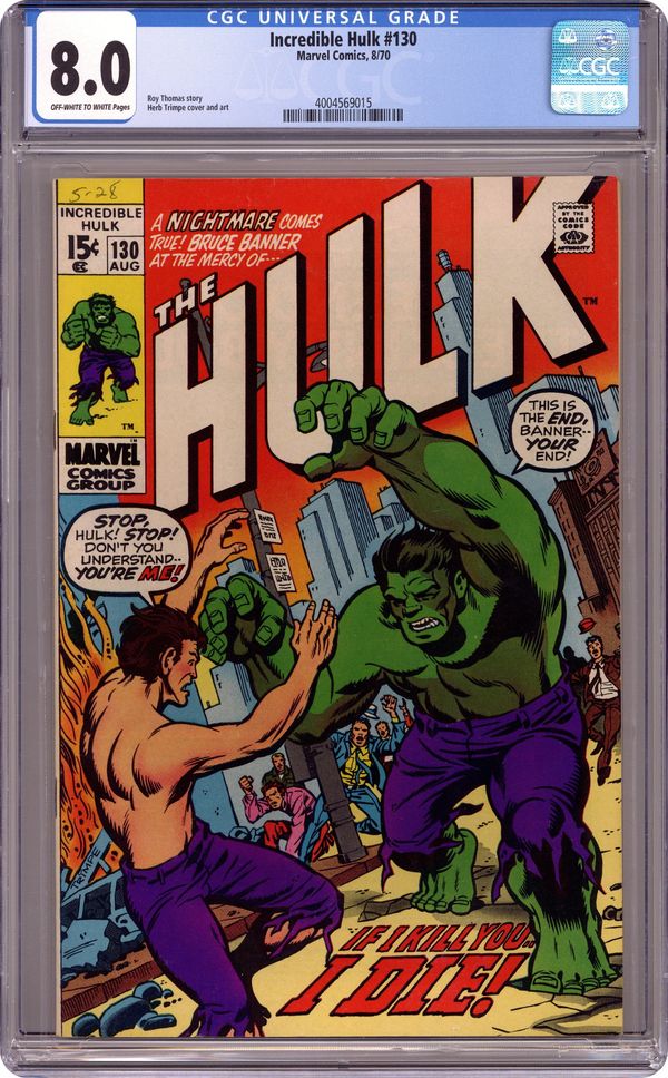 Cover art by Herb Trimpe. If I Kill You, I Die!, script by Roy Thomas, art by Herb Trimpe; Bruce Banner reunites with an old classmate in gamma studies and the two cobble together a machine to end the menace of the Hulk; When Raoul uses the gammatron, it separates Bruce and the Hulk into two individual beings; Banner runs to Ross with the Hulk in hot pursuit and he decides that the only way to contain him is to merge once again with the jade giant. Continued from Captain Marvel #21. 36 pgs. $0.15. Cover price $0.15. Grade: CGC 8.0 explanation of grade Condition: Used (collectible)