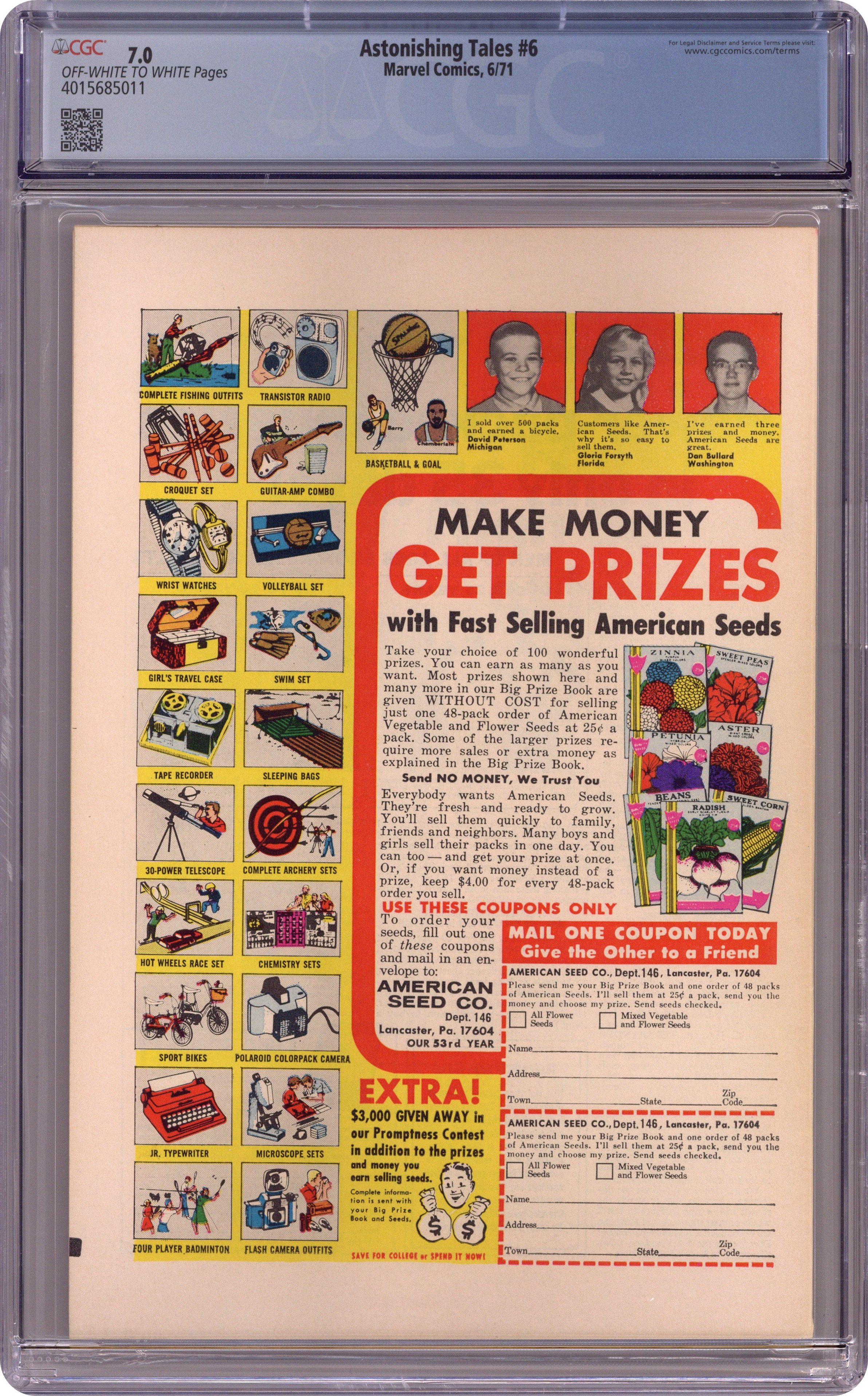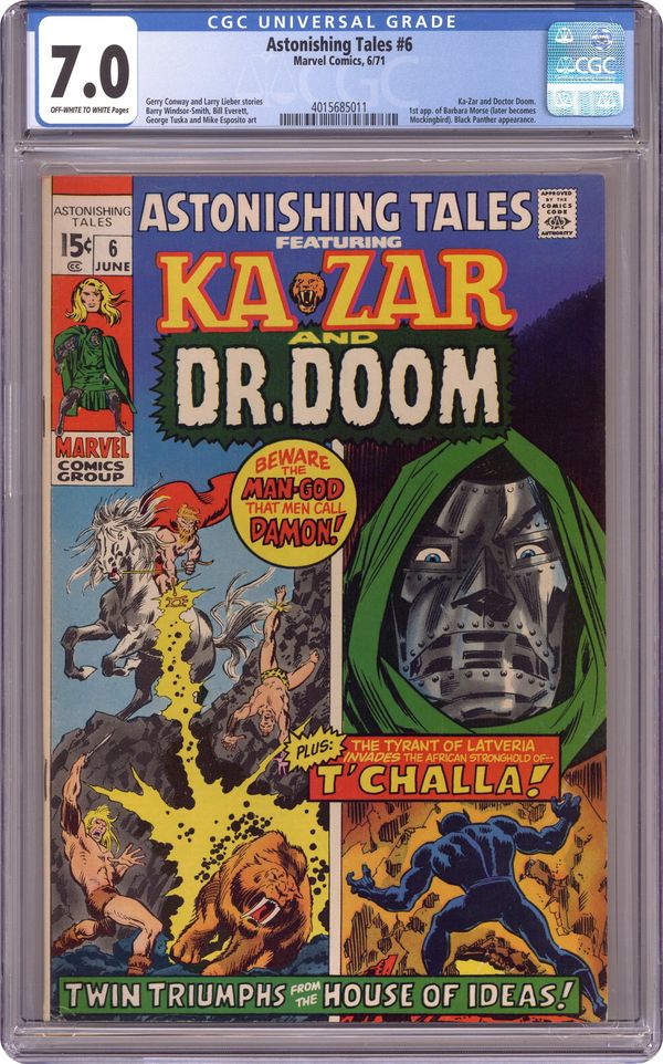 1st Appearance of Bobbi Morse (she later becomes Mockingbird) - Cover pencils by John Buscema, inks by Frank Giacoia. 'Ware the Winds of Death, script by Gerry Conway, pencils by Barry Windsor-Smith [as Barry Smith], inks by Bill Everett; Introduction of Damon the Man-God and his subsequent attack on the Savage Land; Also introduces Bobbi Morse and Tongah's sister and brother, Tatia and Emuel. Advertisement for posters of Fantastic Four, the Black Knight, Silver Surfer and Galactus, and Thor, with a subscription to Marvelmania also included. The Tentacles of the Tyrant!, script by Larry Lieber, pencils by George Tuska, inks by Mike Esposito; Dr. Doom travels to Wakanda to steal Vibranium. Stan Lee's Soapbox. 32 pgs. $0.15. Cover price $0.15. Grade: CGC 7.0 explanation of grade Condition: Used (collectible)
