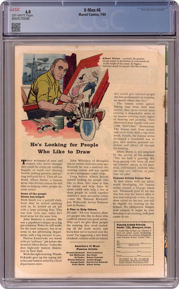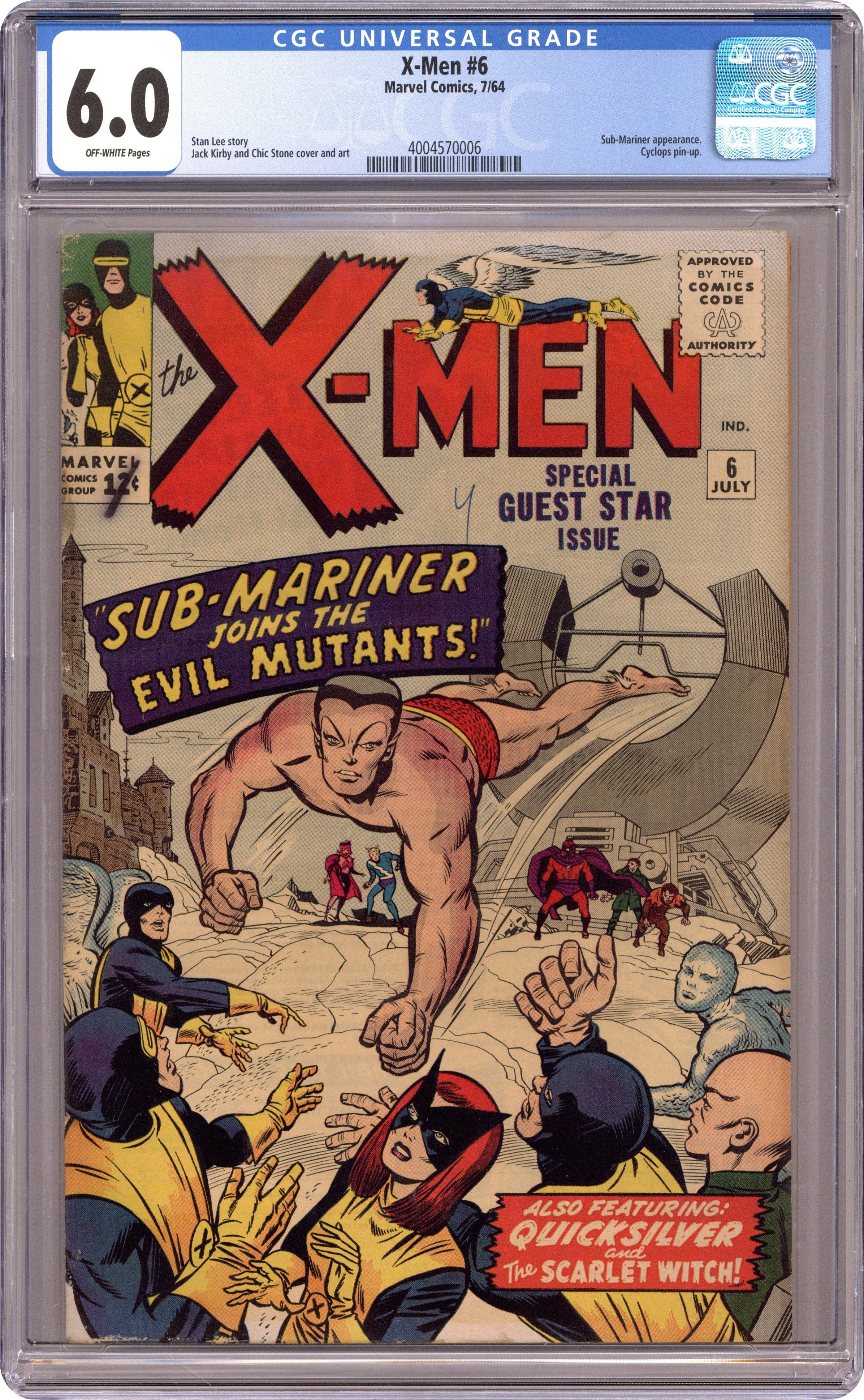 Cover pencils by Jack Kirby, inks by Chic Stone. Sub-Mariner! Joins the Evil Mutants, script by Stan Lee, pencils by Jack Kirby, inks by Chic Stone; Xavier reads a news story about Namor and wonders if he is a possible mutant; Magneto comes to the same conclusion and invades the Sub-Mariner's realm with an invitation to join his Brotherhood; Enchanted by the Scarlet Witch, Namor agrees; The X-Men attack and, during the ensuing battle, Namor decides not to join either team, mutant or no. Cyclops Special Pin-Up Page, pencils by Jack Kirby, inks by Chic Stone. 36 pgs. $0.12. Cover price $0.12. Grade: CGC 6.0 explanation of grade Condition: Used (collectible)