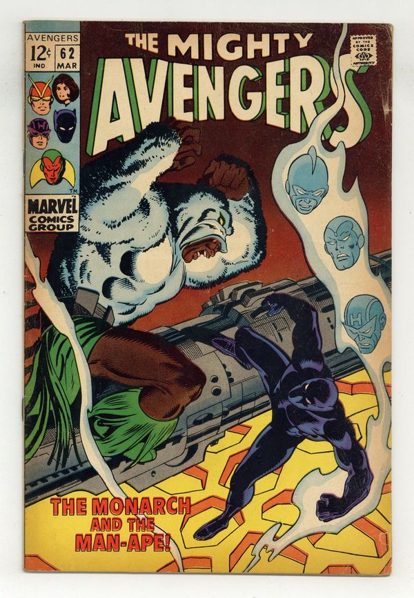"The Monarch and the Man-Ape" First appearance of the Man-Ape. Script by Roy Thomas. Pencils by John Buscema. Inks by George Klein. Cover by John Buscema and George Klein. After their encounter with Ymir and Surtur, the Avengers travel to the Black Panther's homeland to recuperate! But unfortunately there is something rotten in the state of Wakanda! M'Baku, one of T'Challa's mightiest warriors, has usurped the throne and secretly taken on the identity of the Man-Ape! However, the Avengers don't know that when they sit down for the evening feast! Once his teammates succumb to M'Baku's drugged wine, the Black Panther must face his royal challenger alone! In the heart of the jungle, T'Challa battles for his throne and his life vs. the ferocious Man-Ape! Appearance by the Black Knight. Avengers Lineup: Black Panther, Hawkeye, and the Vision. (Notes: The Man-Ape returns in Avengers 78. The cover logo changes to "The Mighty Avengers" thru issue 69. The letters page also contains a statement of ownership: average print run 428,600; average paid circulation 276,951. This story was reprinted in Jungle Action 5.) 36 pages. 12 cent cover price. Cover price $0.12. Grade: VG- 3.5 explanation of grade Condition: Used (collectible)
