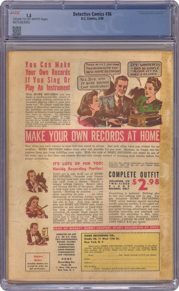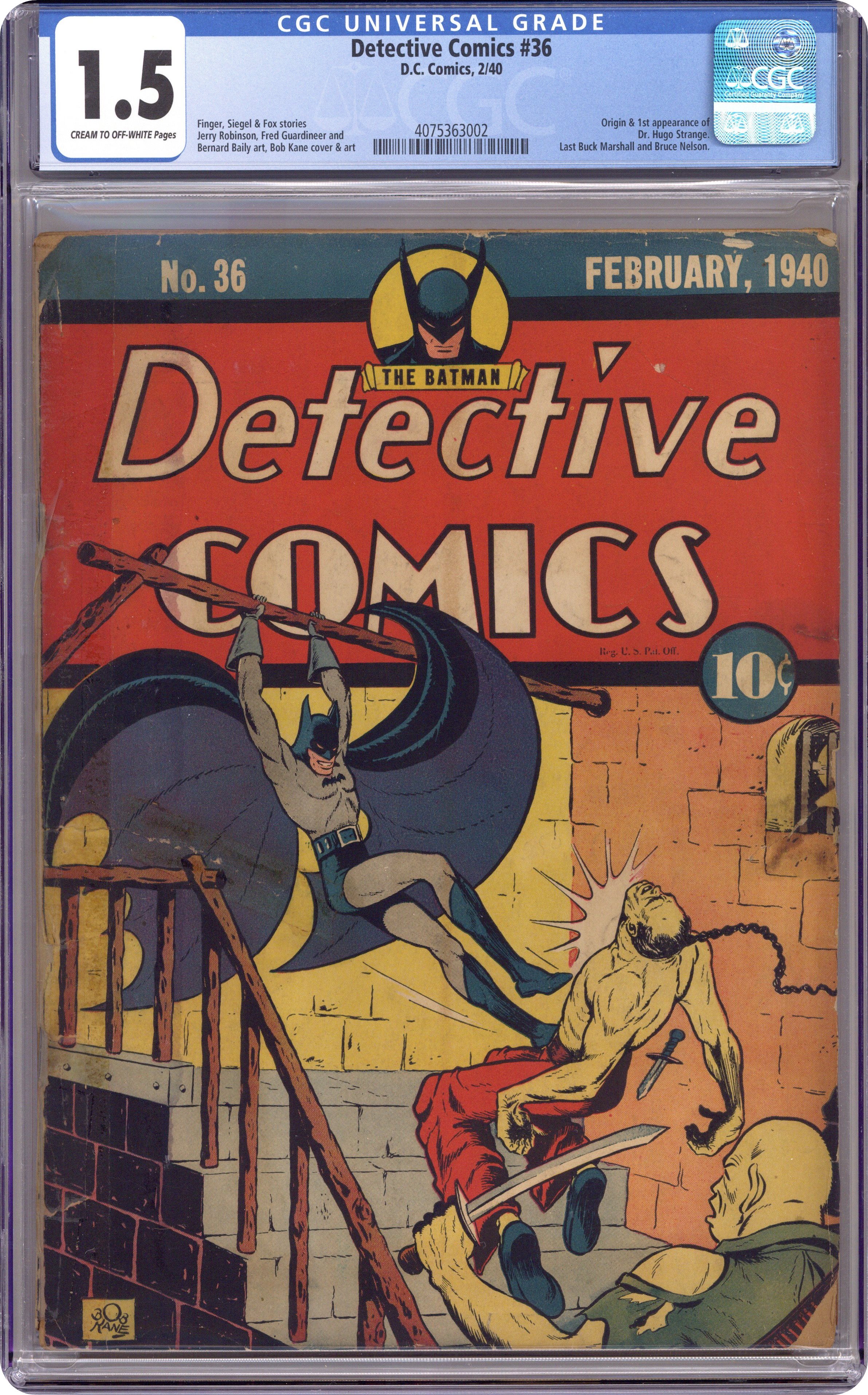 Cover art by Bob Kane. Batman story, script by Bill Finger, art by Bob Kane. Spy story, script by Jerry Siegel, art by Maurice Kashuba. Claim of Satan starring Buck Marshall, Range Detective, art by Homer Fleming. Steve Malone, District Attorney story, art by Don Lynch. The Spider starring Speed Saunders, Ace Investigator, script by Gardner F. Fox, art by Fred Guardineer. Cosmo, the Phantom of Disguise story, art by Sven Elven. A Climax in Opera text story, script by Richard Martin, art by Bernard Baily. Bruce Nelson story, script and art by Tom Hickey. Slam Bradley story, script by Jerry Siegel, art by Mart Bailey. 68 pgs. $0.10. Origin and 1st appearance of Dr. Hugo Strange. 1st finned gloves worn by Batman. Cover price $0.10. Grade: CGC 1.5 explanation of grade Condition: Used (collectible)