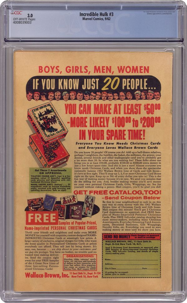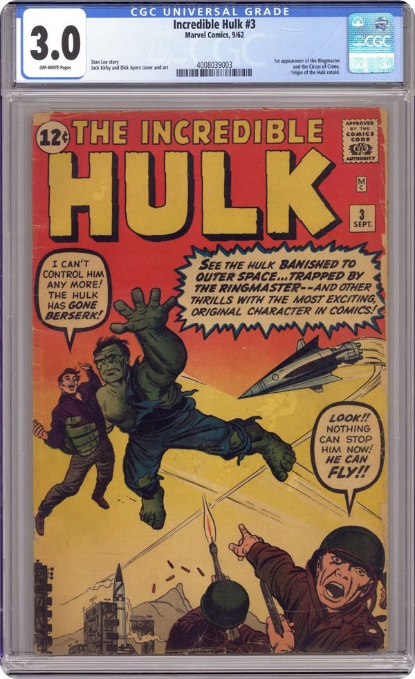 Cover pencils by Jack Kirby, inks by Dick Ayers. First Silver Age appearance of the Ringmaster and the Circus of Crime in "Banished to Outer Space!;" The military captures Rick and Ross convinces him that they need the Hulk to test a new experimental rocket for national security; Rick tricks the jade giant into the capsule but once it is shot into space, he realizes that Ross deceived him to get rid of his foe. "The Origin of the Hulk!," script by Stan Lee, pencils by Jack Kirby, inks by Dick Ayers. The Ringmaster, script by Stan Lee, pencils by Jack Kirby, inks by Dick Ayers; Rick takes a break from his Hulk-sitting duties and goes to the circus. 36 pgs., full color. $0.12. Cover price $0.12. Grade: CGC 3.0 explanation of grade Condition: Used (collectible)