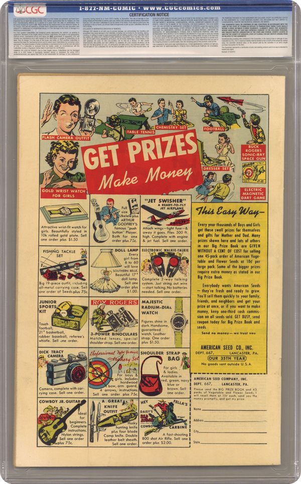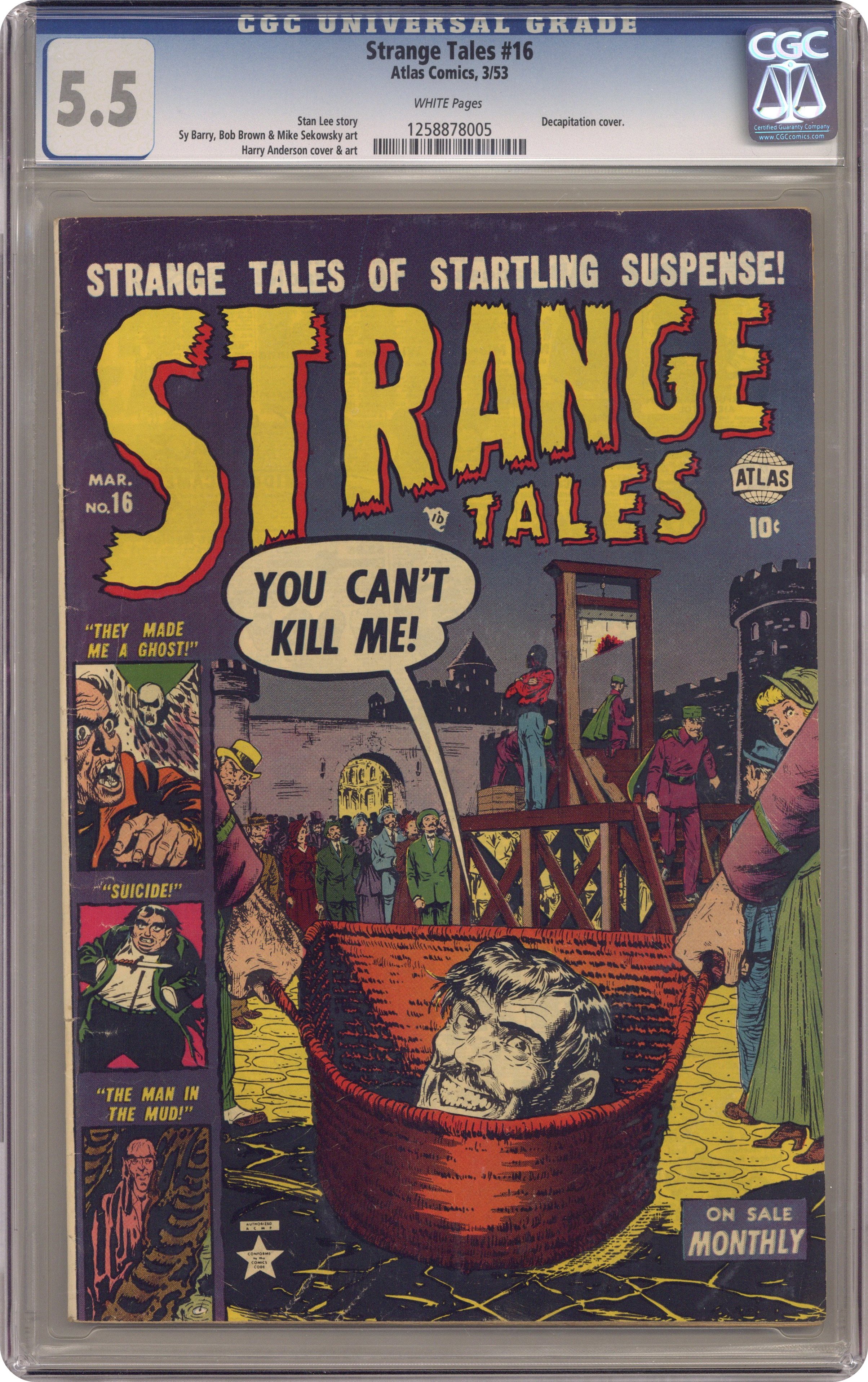 Cover art by Harry Anderson. You Can't Kill Me, script by Stan Lee, art by Harry Anderson; A scientist develops a method of reattaching severed heads. The Hitchhiker text story. The Man In the Mud, art by Sy Barry. The Sissy, art by Bob Brown. Suicide, art by Louis Zansky. They Made Me a Ghost, script by Stan Lee, pencils by Mike Sekowsky; A condemned man makes a deal with Satan to be made a ghost so that he can haunt the judge responsible for his sentence. 36 pgs. $0.10. Cover price $0.10. Grade: CGC 5.5 explanation of grade Condition: Used (collectible)