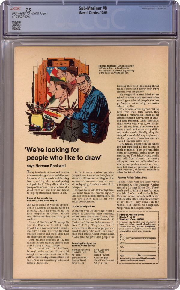 Ended Oct 20 2023 Winning Bid $105 1st Printing. "In the Rage of Battle!" Guest-starring the Thing. Written by Roy Thomas. Art by John Buscema and Dan Adkins. It's the heavyweight bout for the championship as the Savage Sub-Mariner clashes with the ever-lovin' blue-eyed Thing! 36 pages, full color. NOTE: 1994 JC Penney reprint exists. Can be identified by having a Stridex ad on the back cover. Cover price $0.12. Grade: CGC 7.5 explanation of grade Condition: Used (collectible)