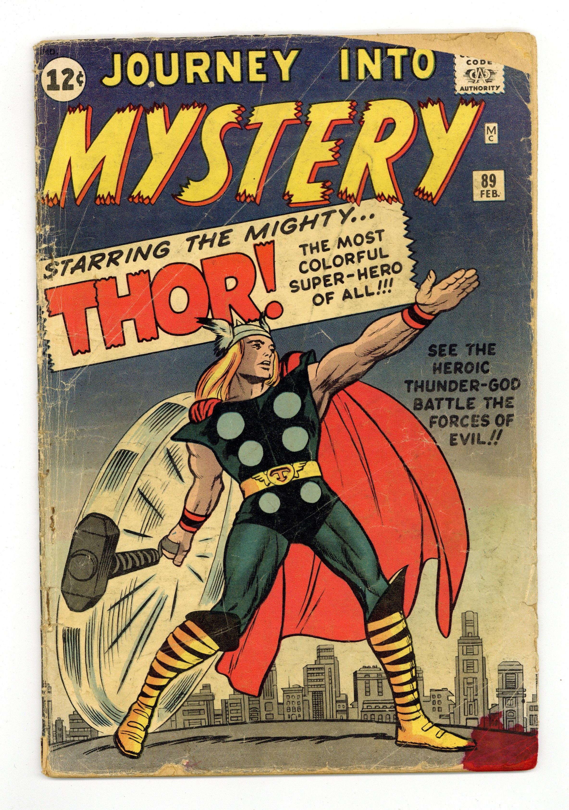 Cover pencils by Jack Kirby, inks by Dick Ayers. Thor's origin is retold in "The Thunder God and the Thug!", script by Stan Lee (plot) and Larry Lieber (script), pencils by Jack Kirby, inks by Dick Ayers; A gangster, wounded in an escape, has his men kidnap Dr. Blake to operate on his gunshot wound; Blake transforms himself into Thor and brings the gang to justice and rescues Jane as well; Jane Foster guest appearance ("Foster" as last name finally used). "From Outer Space" text story. "Barker's Body Shop!", script by Stan Lee (plot) and Larry Lieber (script), art by Sol Brodsky; A crooked mechanic hires a drifter to customize a car, promising enough money for him to get home; When he refuses to pay the man the drifter takes the car instead, which he converted to be able to fly him home to the stars. "When the Switch Is Pulled," script by Stan Lee, art by Steve Ditko; A time machine seems not to work, but actually travelled in a complete loop through time back to its point of origin. 36 pgs., full color. Cover price $0.12. Grade: PR 0.5 explanation of grade Condition: Used (collectible)