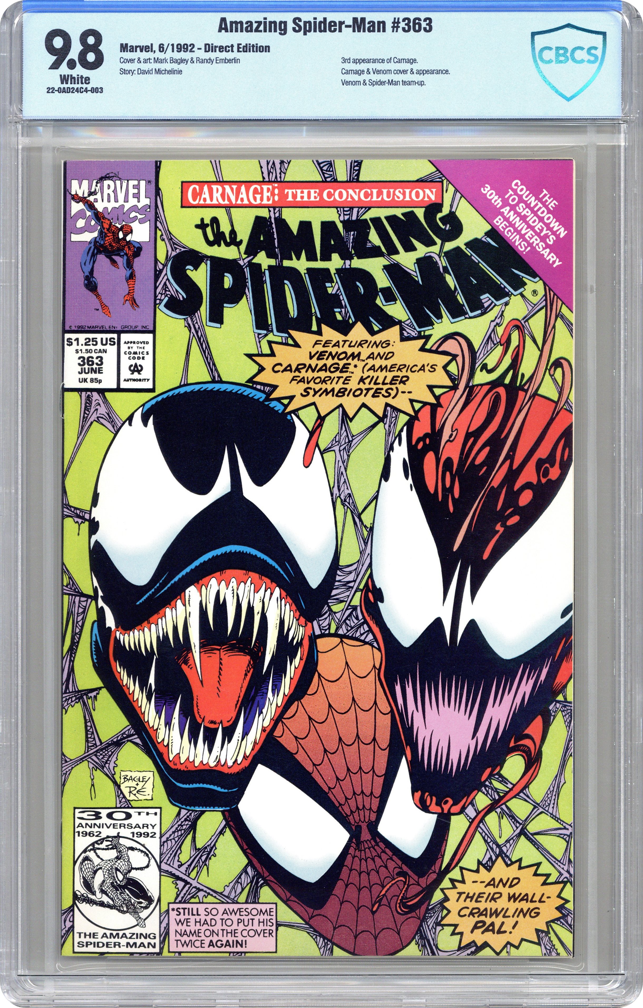 Direct Edition. "Savage Grace!" Part 3 of 3. Script by David Michelinie. Pencils by Mark Bagley. Inks by Randy Emberlin. Cover by Mark Bagley and Randy Emberlin. Carnage takes J. Jonah Jameson hostage and drags him to a heavy metal concert at Madison Square Garden! The psychotic killer plans to execute JJJ in front of thousands of headbangers! But before Carnage can deliver the deathblow, Spider-Man and Venom strike! The ferocious fight leads into the subway tunnels and then back onto the concert stage! Where thanks to MSG's awesome sound system, the web-slinger tries to knock out both Carnage and Venom! The wall-crawler's ploy better work, because double-crossing Venom could have lethal consequences! A fantastic finish! First appearances of the Richard Parker and Mary Parker life model decoys (LMD's). Cameo appearances by Joe Robertson, Mr. Fantastic, and the Human Torch. (Notes: Venom appears next in the one-shot: Spider-Man Special Edition -- The Trial of Venom (1992). Carnage returns in the first issue of Spider-Man Unlimited (1993 1st series) to kick off the Maximum Carnage saga.) 36 pages. $1.25 cover price. Cover price $1.25. Grade: CBCS 9.8 explanation of grade Condition: Used (collectible)