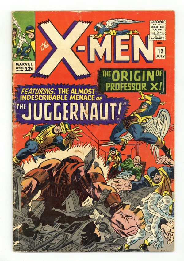 Ended Oct 12 2023 Winning Bid $400 Cover pencils by Jack Kirby, inks by Frank Giacoia. The Origin of Professor X!, script by Stan Lee, pencils by Jack Kirby (layouts) and Alex Toth (pencils), inks by Vince Colletta; Cerebro detects a powerful mutant and Xavier fears that he knows who it is; The X-Men prepare the mansion for an all out assault; As the mysterious villain batters his way through the mansion's defenses, Professor X tells his students his origin story and how his step-brother changed from tormenting bully to an unstoppable Juggernaut; 1st appearance of the Juggernaut. 36 pgs. $0.12. Cover price $0.12. Grade: GD 2.0 explanation of grade Condition: Used (collectible)