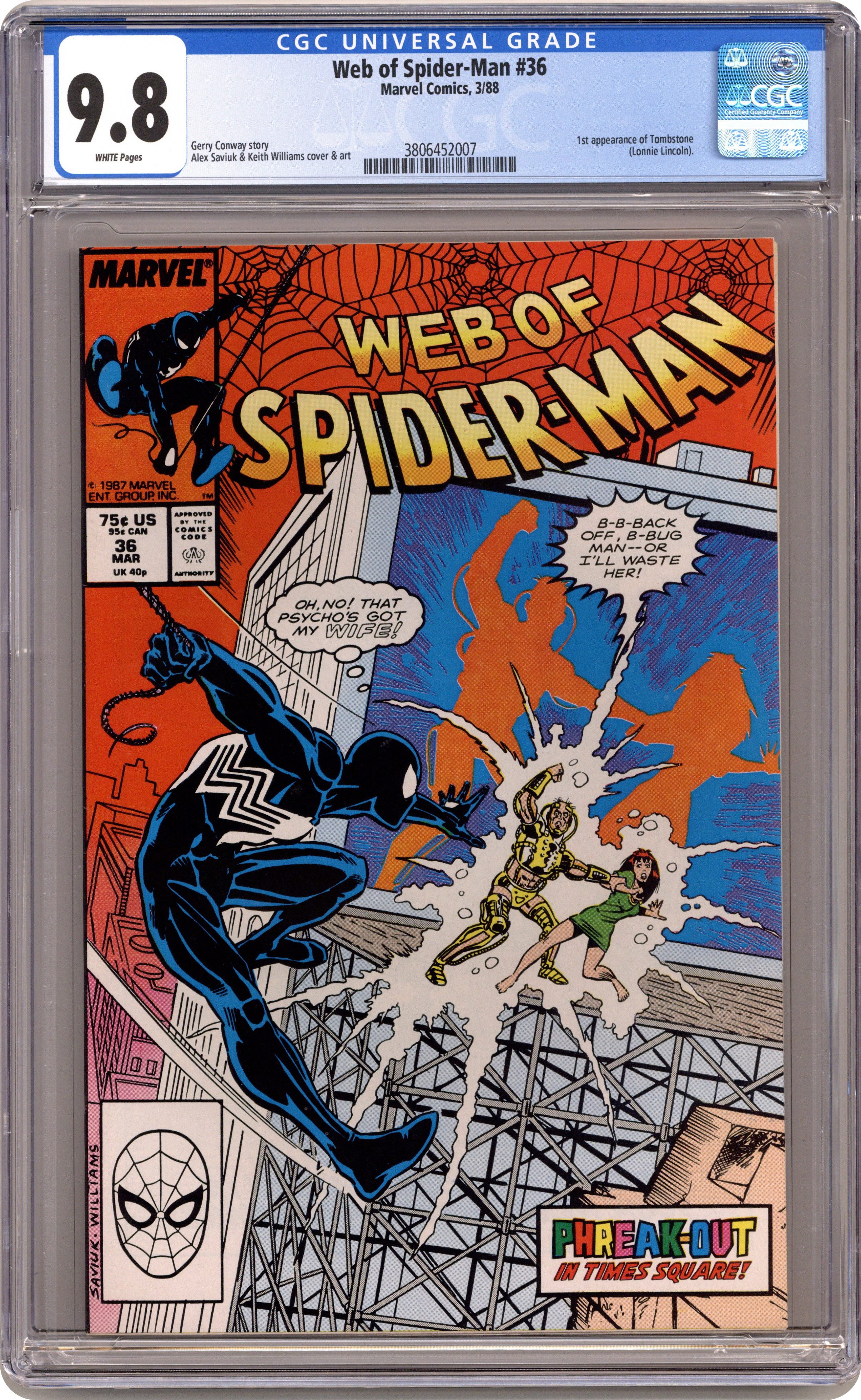 Direct Edition. "Phreak-Out!" Story by Gerry Conway. Art by Alex Saviuk and Keith Williams. The young scientist from the previous issue is still on the loose, and now he has built his own powerful exo-skeleton. The Phreak goes to Peter Parker's apartment and abducts Mary Jane; setting the stage for a showdown with Spider-Man over Times Square! Meanwhile, Joe Robertson is horrified to see a chilling old acquaintance and a soon-to-be new villain for Spider-Man. First appearance of Tombstone. 32 pages Cover price $0.75. Grade: CGC 9.8 explanation of grade Condition: Used (collectible)