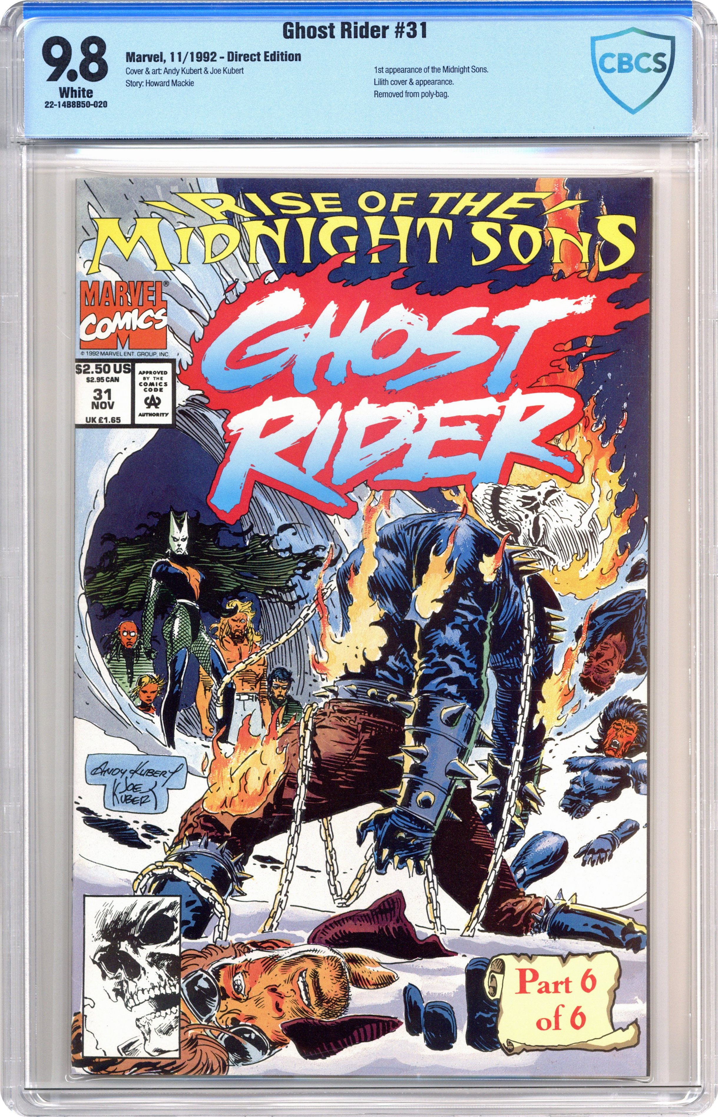 Unbagged. Direct Edition. Rise of the Midnight Sons: Part 6 of 6 - Guest-starring Nightstalkers, Blade, Frank Drake, Hannibal King, Morbius and Doctor Strange. Written by Howard Mackie. Art by Andy Kubert and Joe Kubert. Story continued from Nightstalkers (1992) #1. Danny Ketch's spirit walks a path between dimensions seeking to return to life. Meanwhile, after an unsuccessful battle against the Midnight Sons in Boston, the demon Lilith orders her offspring Portal to teleport her and her Lilin children to Greenland, and the remains of the Leviathan within which Atlantean sorcerers trapped her for millennia. Once there, Lilith begins a spell to return the rest of her long-lost Lilin to earth. Having detected her actions, Dr. strange gathers the Midnight Sons, teleporting them to the Leviathan site. As they attacked the Lilin, Lilith opens in interdimensional rift in her own body, and reaches in, snatching Dan sold from the void and pulling it to Earth, transformed into a monstrous Lilin. Filled with battle lust, he attacks both sides until Ghost Rider restrains him, then throws him back through the rift. The Midnight Sons slay almost all the Lilin, and Ghost Rider forcibly folds Lilith into her own body's rift, causing her to seemingly explode. After the Sons depart, the sole surviving Lilin, Nakota, emerges from the snow; Lilith appears, and needing sustenance to restore herself, devours her child, vowing the Lilin will be reborn and destroy the Midnight Sons. 32 pages, FC. Cover price $2.50. Grade: CBCS 9.8 explanation of grade Condition: Used (collectible)