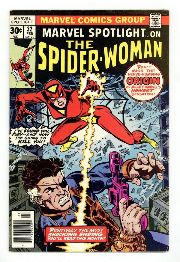 Ended Feb 11 2024 Winning Bid $54 Origin and 1st appearance of Spider-Woman. Cover pencils by Gil Kane and John Romita (alterations), inks by Dick Giordano (?) and John Romita (alterations). Dark Destiny!, script by Archie Goodwin, pencils by Sal Buscema (breakdowns) and Jim Mooney (finished art), inks by Jim Mooney; the mysterious Spider-Woman is tricked by Hydra into trying to kill Nick Fury. Continued in Spider-Woman #1. 36 pages, full color. Cover price $0.30. Grade: FN- 5.5 explanation of grade Condition: Used (collectible)
