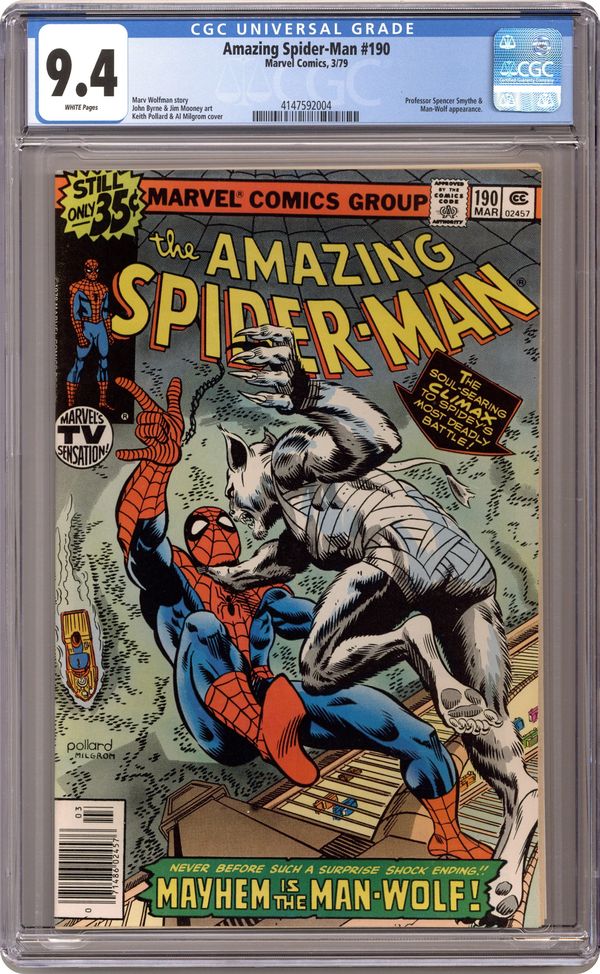 "In Search of the Man-Wolf!" Part 2 of 2. Script by Marv Wolfman. Art by John Byrne (layouts) and Jim Mooney (finishes). Cover by Keith Pollard and Al Milgrom. In incredible fashion the Man-Wolf (aka John Jameson) has reappeared in Manhattan and snatched his father! And now the wondrous wall-crawler chases the lupine beast across the city to rescue Jonah! As Spider-Man and the Man-Wolf battle towards the East River, Professor Spence Smythe revels in his victory! The amazing one finally corners the Man-Wolf atop the Brooklyn Bridge! It's a place the web-slinger knows all too well. With John Jameson's life hanging in the balance, can the Amazing Spider-Man prevent history from repeating itself? A powerful two-part story. (Notes: The plot briefly crosses over with the story in Fantastic Four 204. The Man-Wolf returns in Savage She-Hulk 13 & 14; and battles the web-slinger again in Spectacular Spider-Man Annual 3.) 36 pages Cover price $0.35. Grade: CGC 9.4 explanation of grade Condition: Used (collectible)