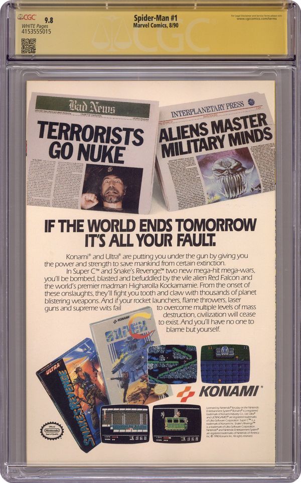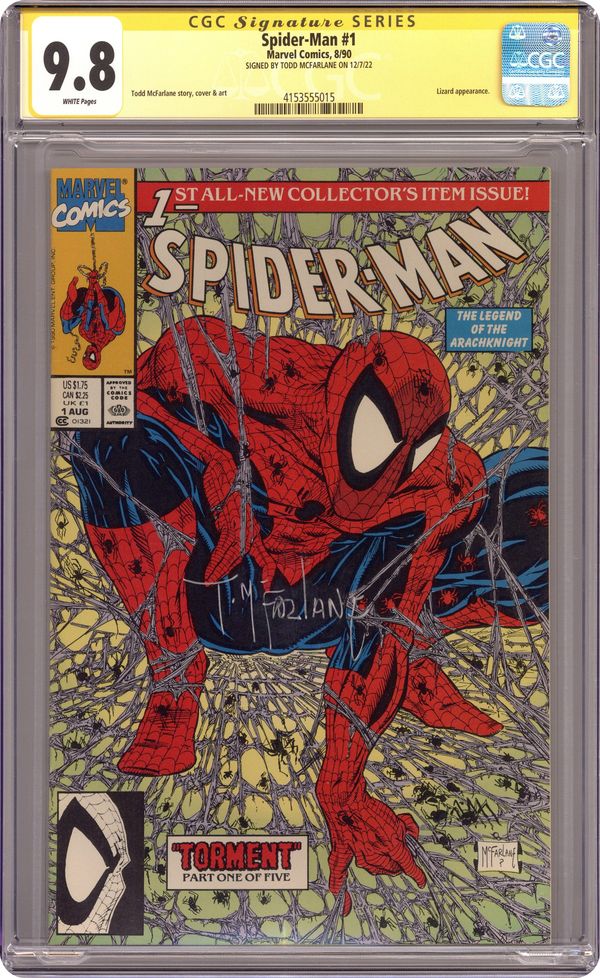 Unbagged Direct Edition - Torment Part 1 of 5. "Torment" Script and art by Todd McFarlane. Cover by Todd McFarlane. Fresh off his legendary run on the Amazing Spider-Man series, superstar artist Todd McFarlane takes the reins of his own Spider-title! Right off the bat the breathtaking action begins as mysterious and ominous drums awaken the Lethal Lizard! And send the reptilian creature on a path of death and destruction thru New York City! Spider-Man's nightmare is just starting! Appearance by Mary Jane Watson. (Notes: Spider-Man #1 was one of the first Marvel issues to feature numerous variant covers. The Spider-Man (1990) series became the fourth monthly title for the web-slinger. This issue was published the same month as Amazing Spider-Man 337. The letters page features an essay by Todd McFarlane. The webbing on the cover may be gray or purple.) 32 pages. Cover price $1.75. Grade: CGC 9.8 explanation of grade Condition: Used (collectible)