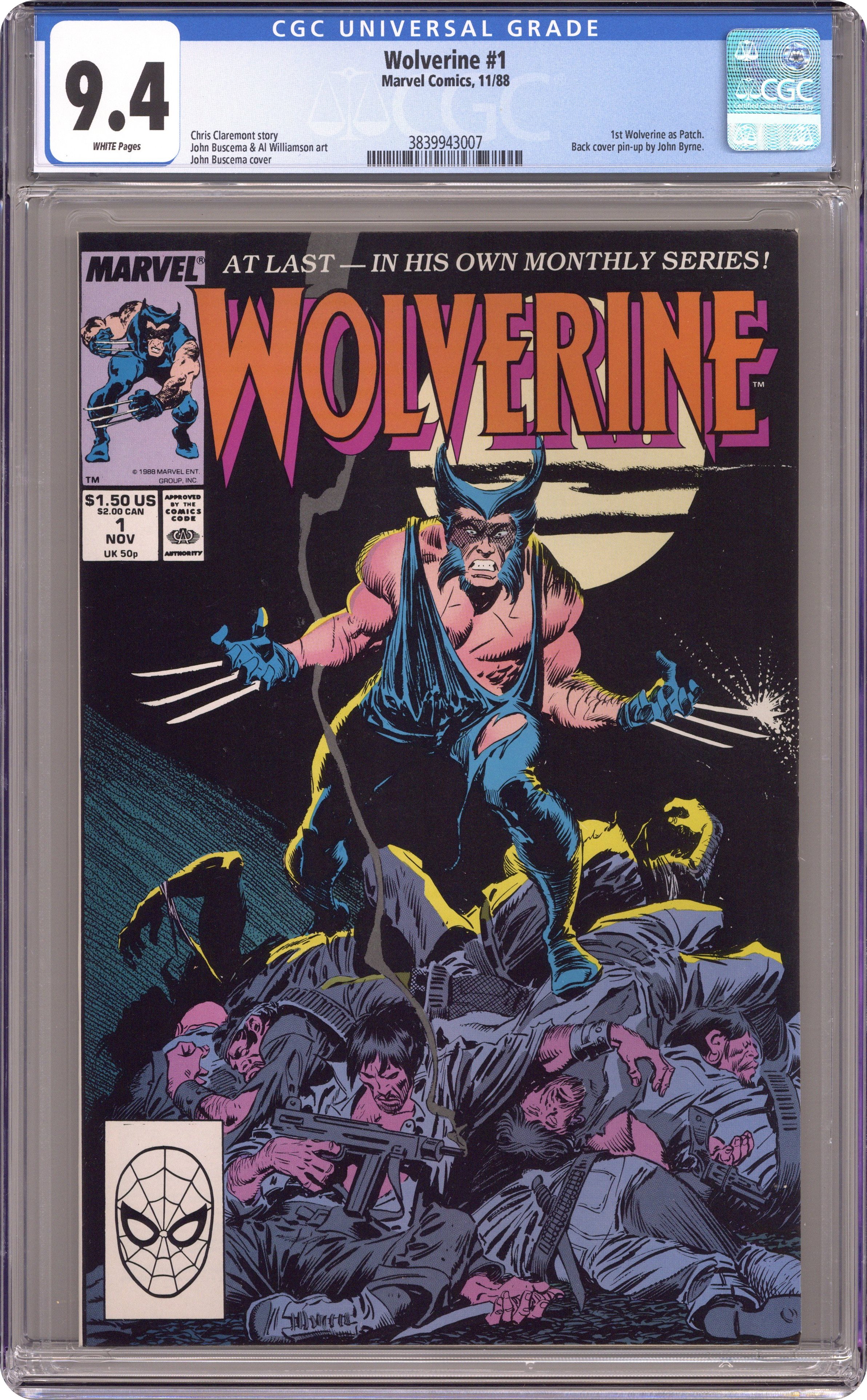 Direct Edition. Part 1 of 3 - "Swordquest!" Written by Chris Claremont. Art by John Buscema and Klaus Janson. Wolvie slices through a pile of pirate slavers, and on his way to Mandripoor discovers a plot by the Black Blade to obtain the legendary Muramasa Sword. John Byrne art on back cover. NOTE: 1st appearance of Wolverine as Patch. Cover price $1.50. Grade: CGC 9.4 explanation of grade Condition: Used (collectible)