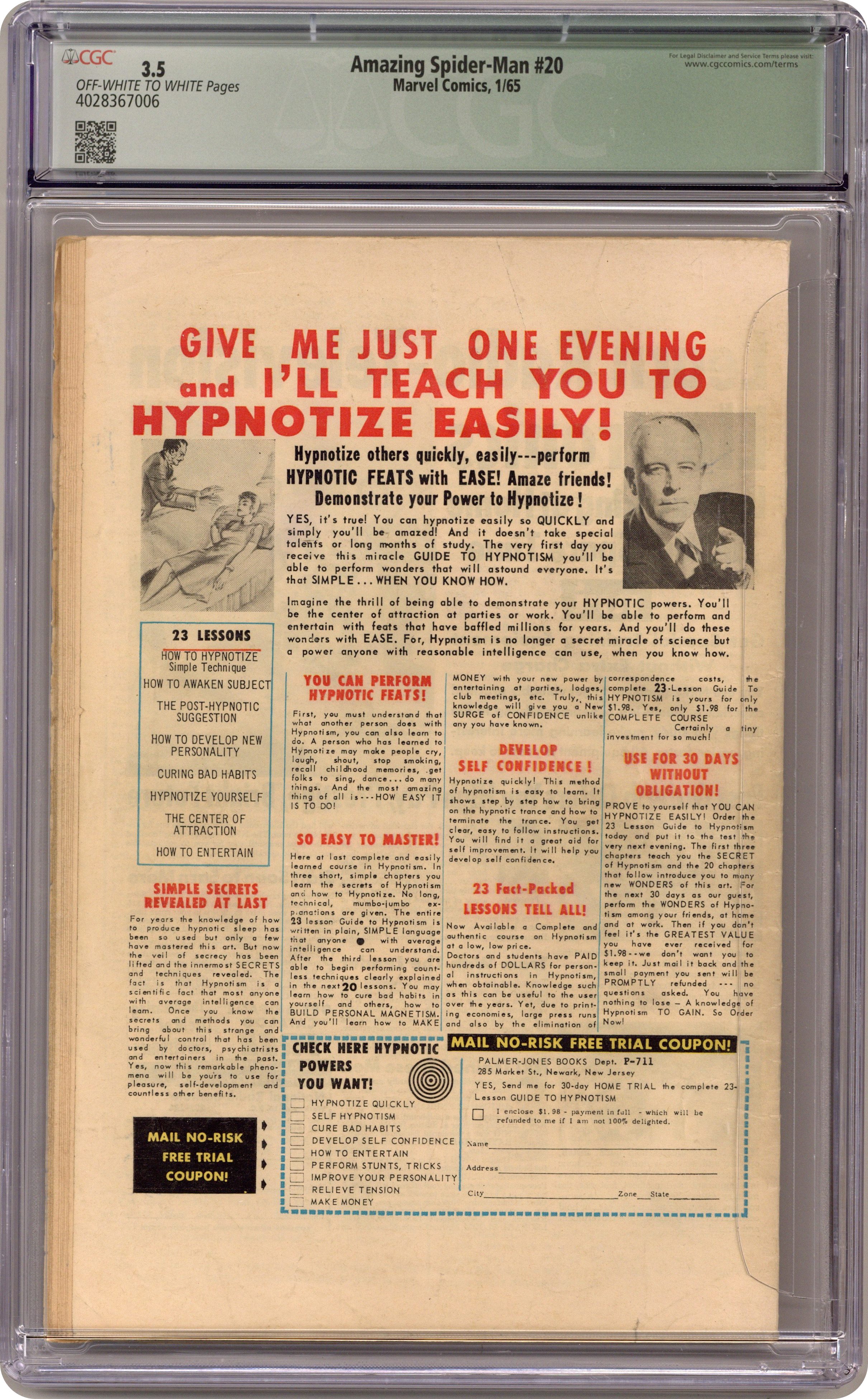 Cover art by Steve Ditko. First appearance of the Scorpion in The Coming of the Scorpion!, script by Stan Lee, art by Steve Ditko; J. Jonah Jameson pays Dr. Stillwell to turn Mac Gargan into the Scorpion to try to capture Spider-Man. Stillwell's formula makes Gargan become more evil than he originally was and the Scorpion goes on a rampage and is finally stopped by Spider-Man. Reprinted in Marvel Tales # 15 and 158. 36 pgs. $0.12. Cover price $0.12. Grade: CGC 3.5 explanation of grade Condition: Used (collectible)
