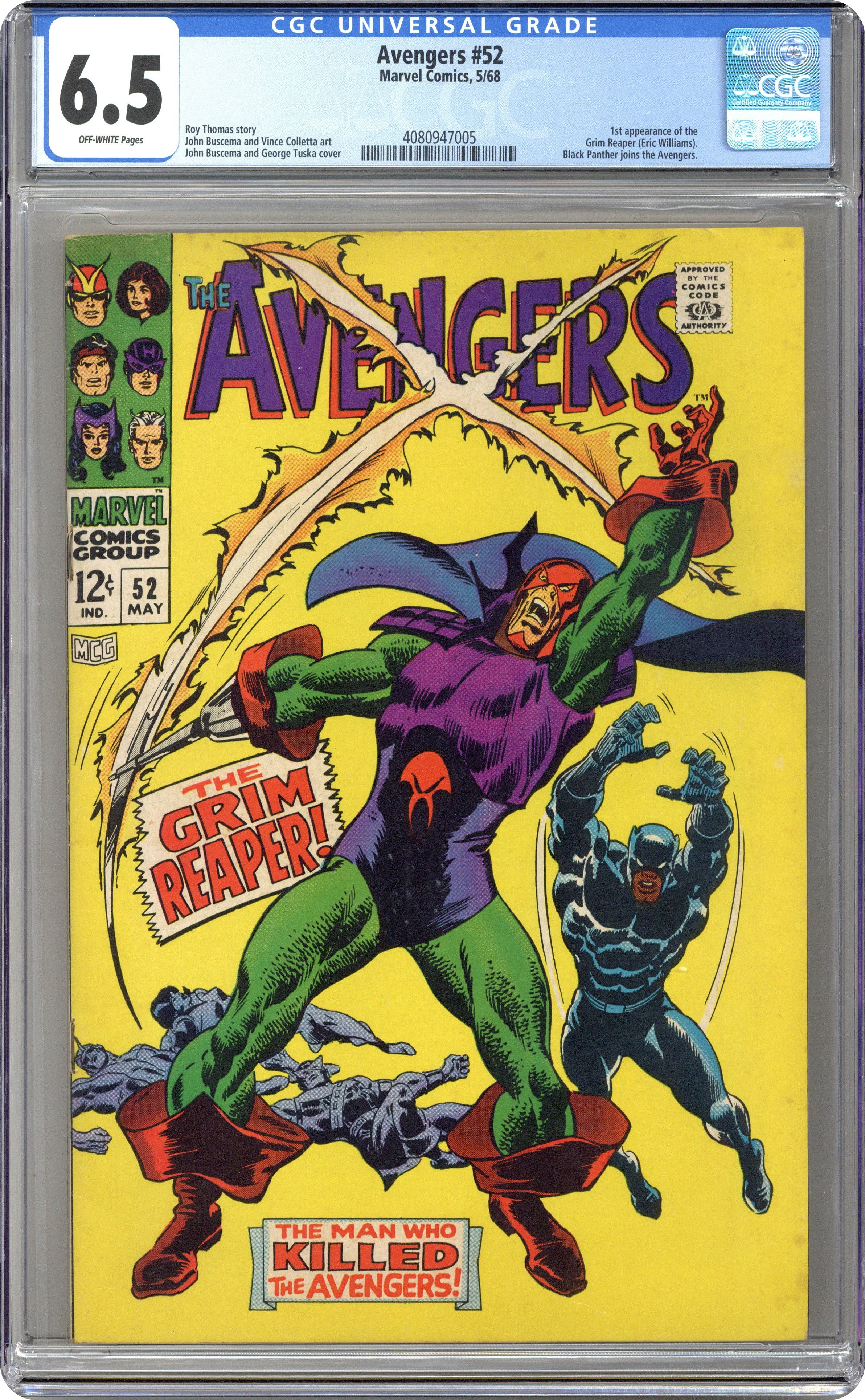 Ended Apr 11 2023 Winning Bid $78 First appearance of the Grim Reaper in "Death Calls for the Arch-Heroes!" Script by Roy Thomas. Pencils by John Buscema. Inks by Vince Colletta. Cover by John Buscema. The Black Panther arrives at Avengers Mansion ready to join Earth's Mightiest Heroes! However when T'Challa reaches the main meeting room, he finds his three would-be teammates lying on the floor unconscious! The panther begins to render first aid, but Jasper Sitwell suddenly appears and arrests him for murder! While being transported to and questioned at the local police station, T'Challa puts the evening's strange pieces together! And the newest avenger rushes back to the mansion to face the true perpetrator! Wow, the Black Panther vs. the Grim Reaper! What a debut for the superhero and the super-villain! Cameo appearances by the Black Widow, Tony Stark, Captain America, and Thor. Flashback cameo by Wonder Man to recap the events of Avengers #9. Avengers Lineup: Black Panther, Goliath, Hawkeye, and the Wasp. (Notes: The Grim Reaper (aka Eric Williams) returns in Avengers #78 to continue his quest for revenge. The letters page includes a letter from comics writer Mike Uslan. This issue was reprinted in Marvel Triple Action #44.) 36 pages. Cover price $0.12. Grade: CGC 6.5 explanation of grade Condition: Used (collectible)