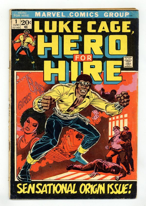 "Out of Hell--a Hero!" Script by Archie Goodwin, pencils by George Tuska, inks by Billy Graham. NOTE: Roy Thomas and John Romita are credited for their "considerable creative contributions." When Lucas, an innocent man, is sent to jail for a crime he did not commit, he decides he has nothing left to loose. Subjecting himself to unorthodox experiments, this inmate is endowed with great physical strength and nigh-unbreakable skin. No walls and bars on Earth can hold him. Now, as Luke Cage, he is known as the Hero for Hire, and he's here to clean up the "Mean Streets," one criminal at a time. Cover price $0.20. Grade: GD- 1.8 explanation of grade Condition: Used (collectible)
