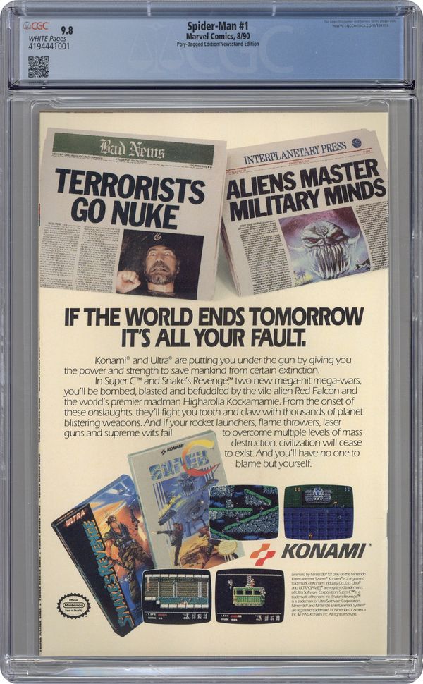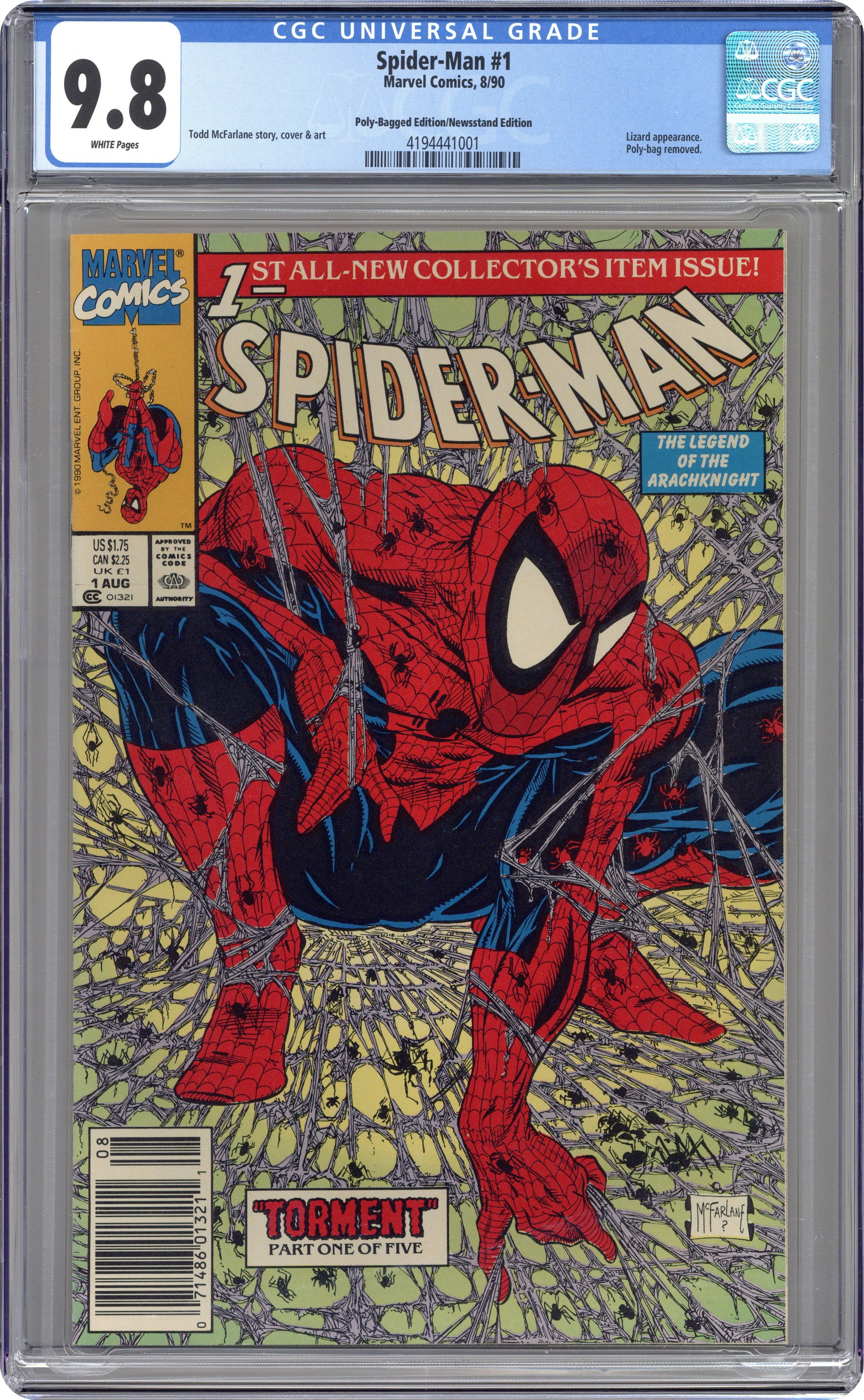 Unbagged Newsstand Edition. Torment: Part 1 of 5. Story, art and cover by Todd McFarlane. Fresh off his legendary run on Amazing Spider-Man, super-star artist Todd McFarlane is given the reigns to his very own Spidey title. Right out of the gate the wall-crawler will be challenged like never before as mysterious and ominous drums in the distance are driving the savage Lizard to cut a swath of death and destruction through the streets of New York City. Can Spider-Man discover the one responsible for this madness before his arch foe causes more damage? NOTE: Webbing on cover may be grey or purple. Cover price $1.75. Grade: CGC 9.8 explanation of grade Condition: Used (collectible)