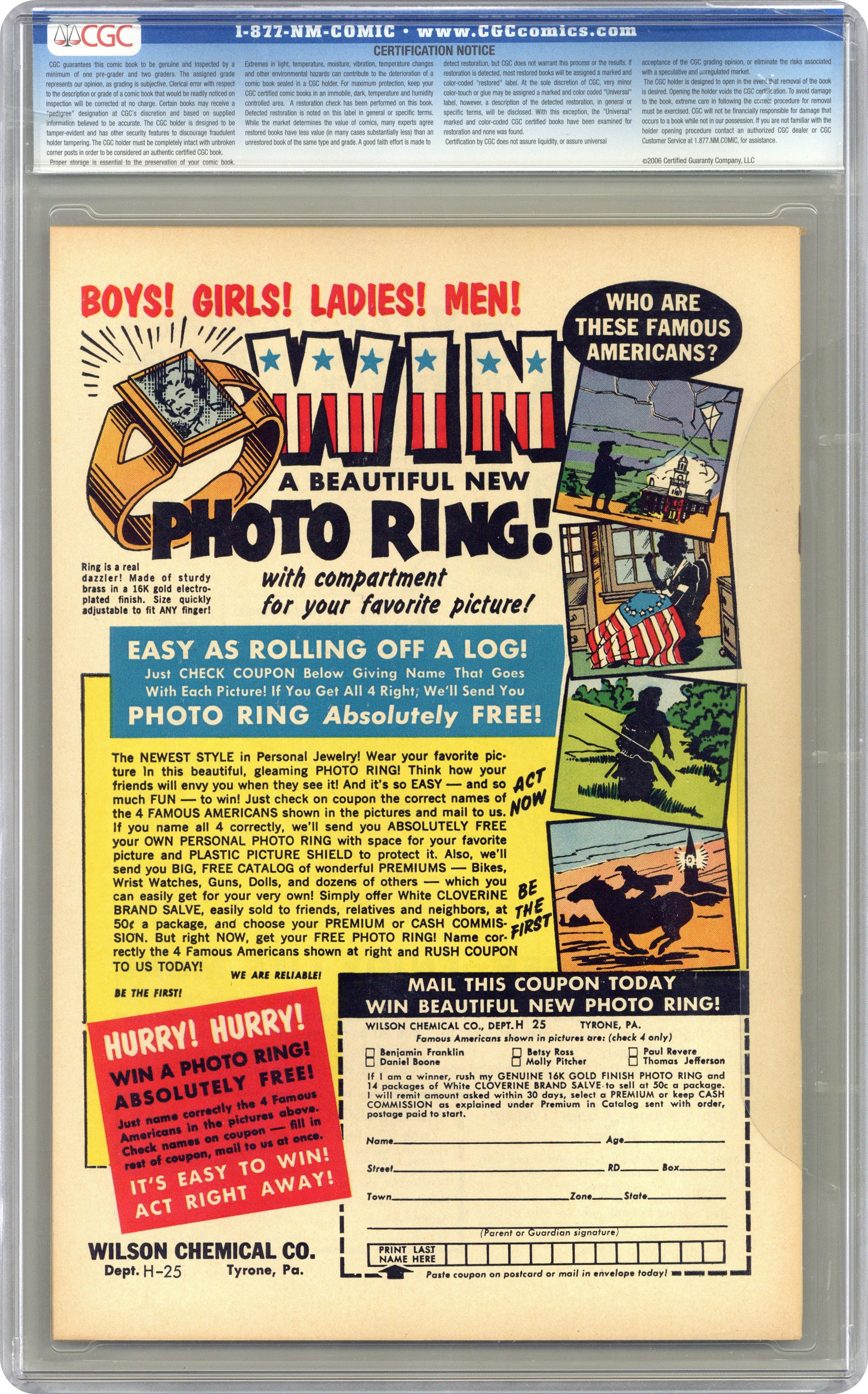 Ended Apr 13 2023 Winning Bid $27 A gigantic duckling toddler with strength to match, well-meaning Huey creates slapstick havoc wherever he goes. The Fox tries to trick Huey by masquerading as a fortune teller, but he doesn't see what's coming next. Katnip creates a super-identity, Sooper Cat, to pursue Herman and the mice. Just Like Papa; The Four-Chin Teller; The Monks; The Gloomy Eagle; Well-Schooled; Herman and Katnip: Sooper Cat. 36 pages, full color. Cover price $0.10. Grade: CGC 9.4 explanation of grade Condition: Used (collectible)