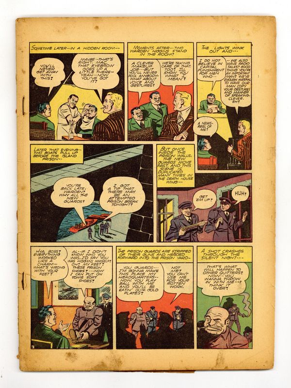 Cover pencils by Fred Ray, inks by Jerry Robinson. "Stone Walls Do Not a Prison Make," script by Bill Finger, pencils by Bob Kane, inks by Jerry Robinson and George Roussos (backgrounds); From prison, Big Mike Russo is able to have his gang kidnap the warden, replace him and the guards with a look alike, then use the prison as a base of operations to commit crimes while providing alibis to those committing them; Batman figures that the only way to uncover this scenario is to get put in prison himself. "The Strange Case of Professor Radium!", script by Bill Finger, pencils by Bob Kane, inks by Jerry Robinson and George Roussos (backgrounds); A scientist finds a way to use radium to bring the dead back to life, and he uses himself as a guinea pig; Although the experiments are successful, the Professor pays dearly for his discovery, for, in the end, as Batman says, it has created a Frankenstein monster. 2-page Chief Hot Foot story by Henry Boltinoff. "The Superstition Murders!", script by Bill Finger, pencils by Bob Kane (signed), inks by Jerry Robinson and George Roussos (backgrounds); The cast of a stage production decides to have a "superstition" party, intentionally carrying out every well-known superstition they can think of; But when one of them is killed, Batman and Robin enter the fray to single out the perpetrator of the deed. "The Cross-Country Crimes!", script by Bill Finger, pencils by Bob Kane, inks by Jerry Robinson and George Roussos (backgrounds); The Caped Crusaders are invited to Washington D.C. to meet with the head of the FBI, but the Joker shows up and shoots the G-Man. 68 Pages, Full Color. Cover price $0.10. Grade: PR 0.5 explanation of grade Condition: Used (collectible)