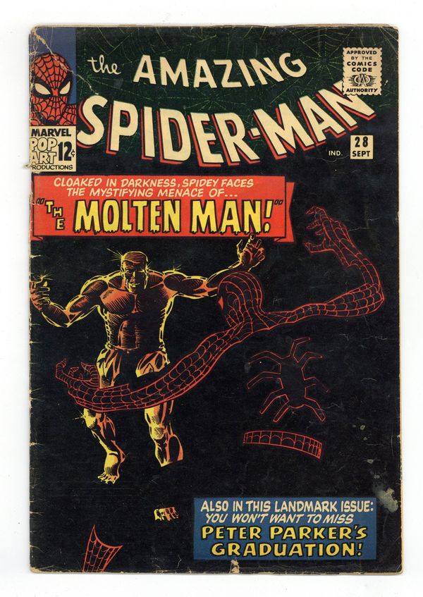 Cover art by Steve Ditko. First appearance of the Molten Man in "The Menace of the Molten Man!", script by Steve Ditko (plot) and Stan Lee (script), art by Steve Ditko; Peter Parker needs his old costume, so he goes to the lab of the inventor Smythe, who created the robot J. Jonah Jameson used to try and beat Spiderman with; During that battle Parker had to remove his costume in order to escape; While there he witnesses an argument between Smythe and a man named Raxton, which results in an accident turning Raxton into, the Molten Man; At first Raxton is confused when he walks out of the lab, but on the street he gets mad at a driver and smashes the car with his fists; Realizing his power Raxton decides he can be a super villain, but before he can do anything Spiderman comes in through his window and asks Raxton to turn himself in stating that so far no major crimes have been committed; A fight ensues; Peter graduates from high school. The Merry Marvel Bullpen Page. Reprinted in Marvel Tales #166. This is a very difficult book to find in the higher grades because the black cover easily shows virtually every imperfection, no matter how minor. 36 pgs., full color. Cover price $0.12. Grade: GD+ 2.5 explanation of grade Condition: Used (collectible)
