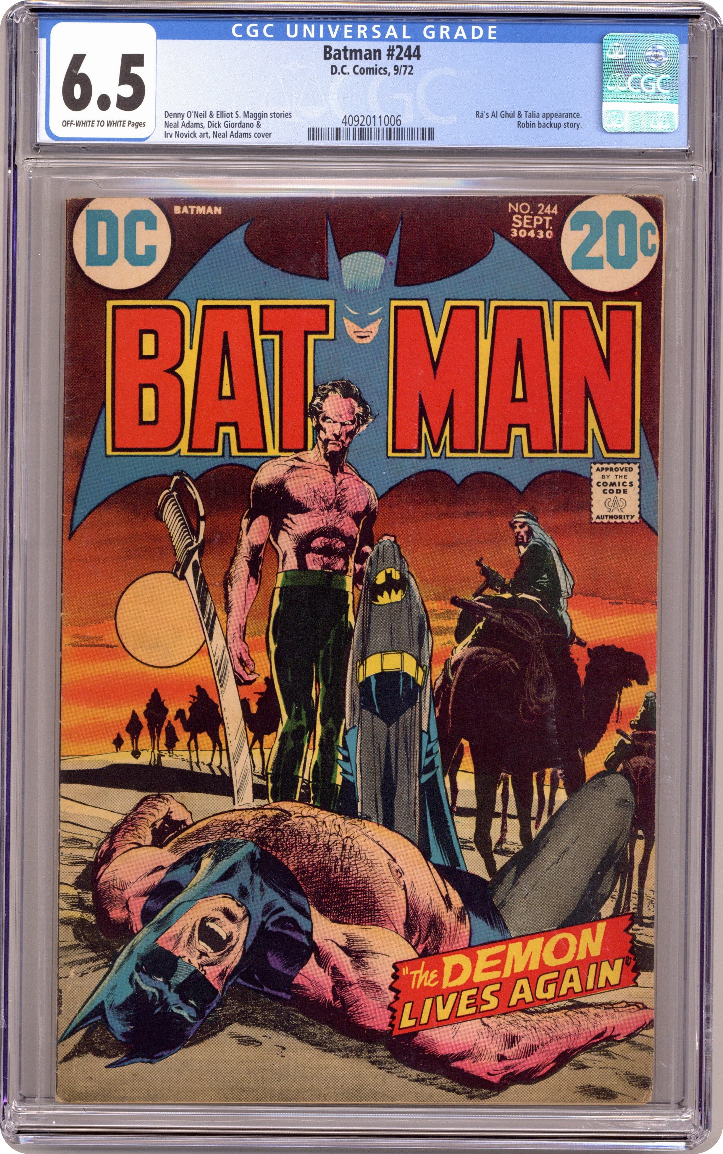 Ended Jul 24 2023 Winning Bid $137 Ra's Al Ghul is back, and with a vengeance. Can Batman defeat the Demon in a one-on-one duel to the death? "The Demon Lives Again!" Talia appearance. Script by Denny O'Neil, pencils by Neal Adams, inks by Dick Giordano. Robin stars in the solo adventure "Teen-Age Trap!" Script by Elliot Maggin, pencils by Irv Novick, inks by Giordano. 36 Pages, Full Color. Cover price $0.20. Grade: CGC 6.5 explanation of grade Condition: Used (collectible)