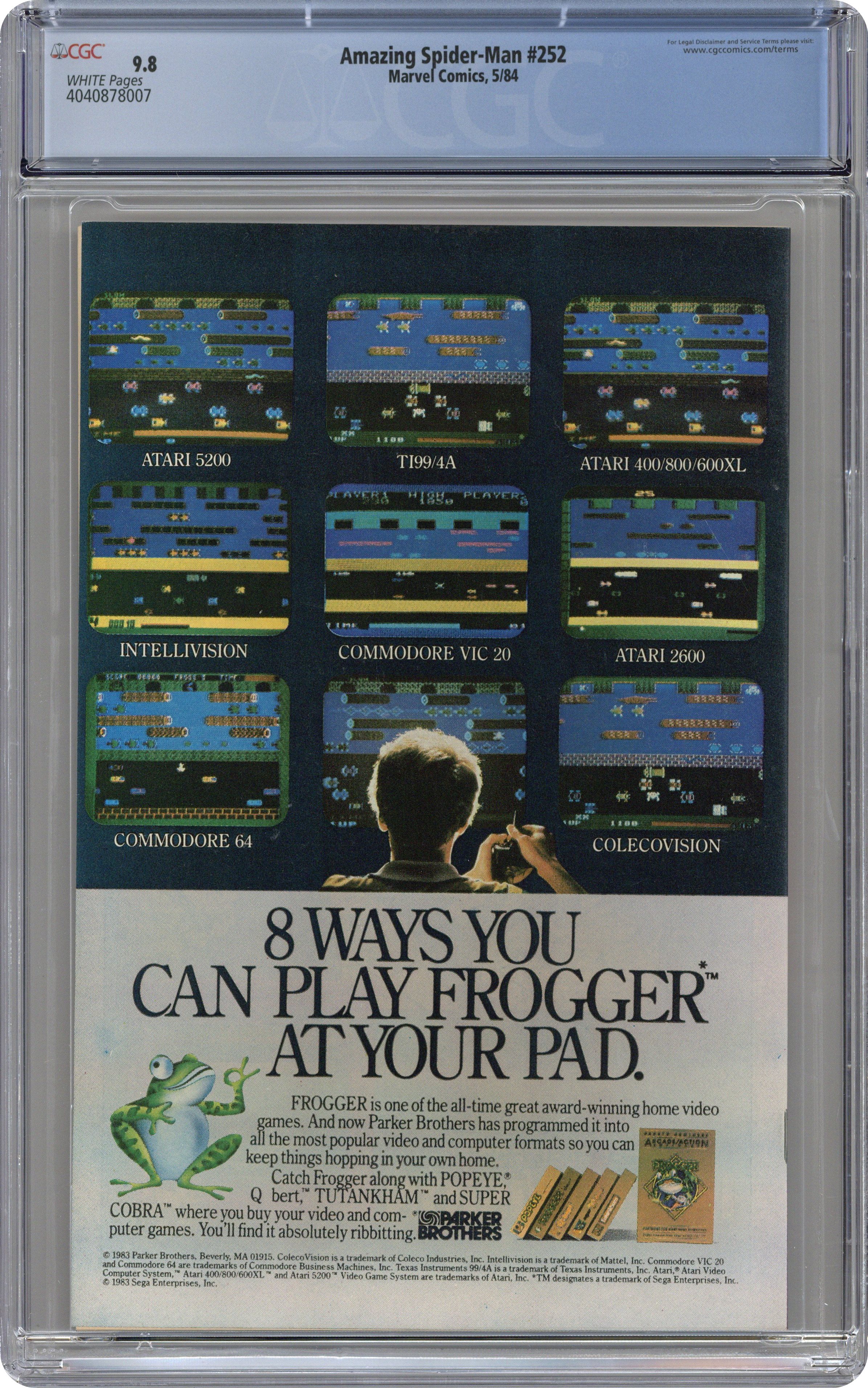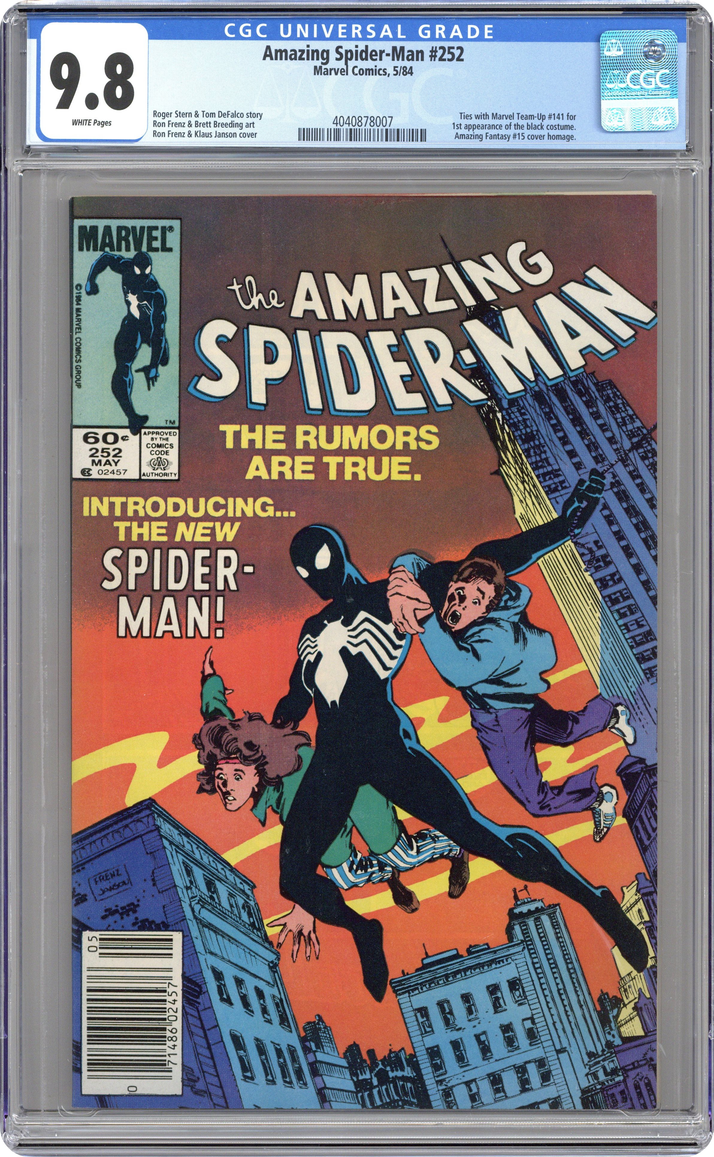 Newsstand Edition. First appearance of Spider-Man's new black (alien symbiote) costume in "Homecoming!" Plot by Roger Stern. Script by Tom DeFalco. Pencils by Ron Frenz (breakdowns) and Brett Breeding (finishes). Cover by Ron Frenz and Klaus Janson. One of the landmark issues of the Amazing Spider-Man! With a brilliant flash of light in Central Park, the wondrous wall-crawler is back! And he looks a whole lot different! Wow, a new costume! What happened during the Secret Wars on the Beyonder's world? The ominous truth will be revealed to both the readers and the web-slinger in the days and weeks ahead! Cameo appearances by the Black Cat, Dr. Curt Connors, J. Jonah Jameson, Joe Robertson , Aunt May, Captain America, Captain Marvel, Hawkeye, Iron Man, Thor, and the Wasp. (Notes: Marvel Age 12 contained sketches of the new costume two months prior to the publication of this issue. Spidey's new costume was also unveiled in Marvel Team-Up 141 and Spectacular Spider-Man 90. The first issue of the (1984) Marvel Super Heroes Secret Wars Limited Series was published the same month as Amazing Spider-Man 252. The web-slinger discovers his new costume in issue 8 of the limited series. The Frenz-Janson cover is a tribute to the iconic cover of Amazing Fantasy 15. This story was reprinted in Marvel Tales 266. The letters page contains a statement of ownership: average print run 470,527; average paid circulation: 241,762. 36 pgs. Cover price $0.60. Grade: CGC 9.8 explanation of grade Condition: Used (collectible)