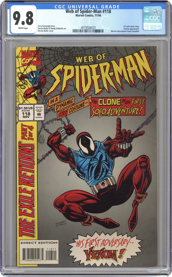 First Printing. Direct Edition. "Exiles Return Part 1 of 4: Memories" Written by Terry Kavanagh. Pencils by Steve Butle. Inks by Randy Emberlin. Venom and Clone appear. Note: First appearance of Ben Reilly as the Scarlet Spider. Cover price $1.50. Grade: CGC 9.8 explanation of grade Condition: Used (collectible)