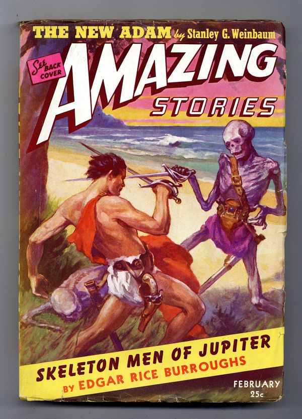 Ended Jul 24 2024 Winning Bid $80 February 1943. Giant Size Issue. Cover by J. Allen St. John. Stories by Edgar Rice Burroughs ("Skeleton Men of Jupiter"), Stanley G. Weinbaum (Part one of "The New Adam"), P.F. Costello, Leroy Yerxa, Stanton A. Coblentz, Dwight V. Swain, Robert Bloch (as Tarleton Fiske), and Jarry Jenkins Jr. Illustrations by St. John, Virgil Finlay, Rod Ruth, Magarian, Hadden, Ned Hadley, Robert Fuqua, and Joe Sewell. 7" x 10"; black and white with color cover; 240 newsprint pages. Cover price $0.25. Grade: VG/FN 5.0 explanation of grade Condition: Used (collectible)