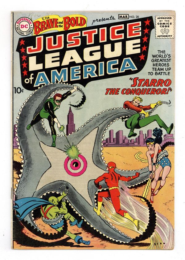 Cover by pencils Mike Sekowsky, inks by Murphy Anderson. First appearance of Justice League of America, Starro, and Snapper Carr in "Starro the Conqueror!", script by Gardner Fox, pencils by Mike Sekowsky, inks by Bernard Sachs, Joe Giella, and Murphy Anderson; Peter the Puffer Fish alerts Aquaman to an attack on Earth from an alien starfish named Starro the Conqueror; Starro has altered three ordinary starfish into his lieutenants; Aquaman alerts his friends Wonder Woman, Superman, Green Lantern, Batman, Flash, and J'onn J'onzz; Though Superman and Batman are too busy to attend, the rest meet and split up into teams. It's Fun to Help Others! public service announcement with Superboy by Jack Schiff, art by Curt Swan and Stan Kaye. Starro vs. Green Lantern, script by Gardner Fox, pencils by Mike Sekowsky, inks by Joe Giella; One of Starro's lieutenants steals and explodes an atomic bomb to absorb its power. Starro vs. Wonder Woman and John Jones, script by Gardner Fox, pencils by Mike Sekowsky, inks by Bernard Sachs. Starro vs. the Flash!, script by Gardner Fox, pencils by Mike Sekowsky, inks by Murphy Anderson. Starro vs. Justice League of America, script by Gardner Fox, pencils by Mike Sekowsky, inks by Bernard Sachs. 36 Pages, Full Color. Cover price $0.10. Grade: VG+ 4.5 explanation of grade Condition: Used (collectible)