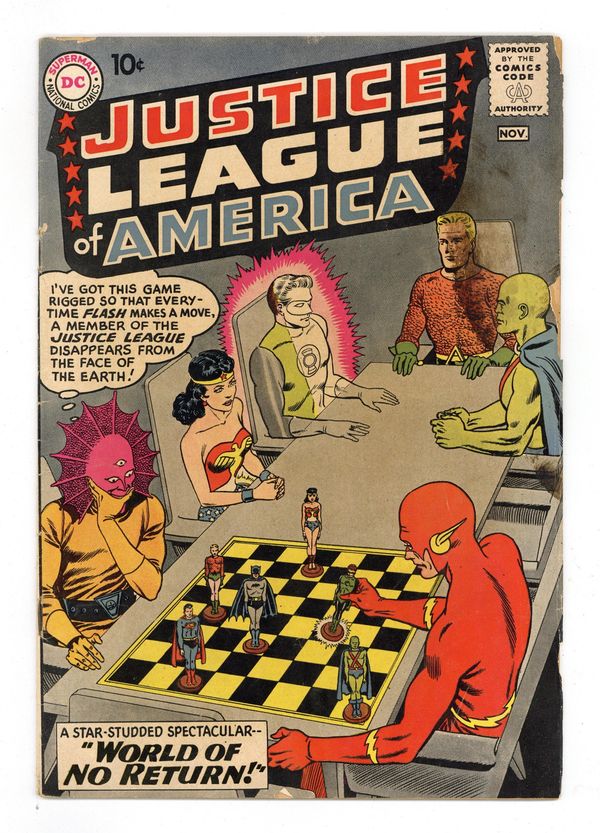 Cover art by Murphy Anderson. The World of No Return!, script by Gardner Fox, pencils by Mike Sekowsky, inks by Bernard Sachs; The Flash must beat Despero in a strange chess-like game to save the other members of the Justice League and the people of Despero's home dimension, Kalanor. Letter to the editor from comic writer Roy Thomas. 36 pgs. $0.10. Cover price $0.10. Grade: GD+ 2.5 explanation of grade Condition: Used (collectible)