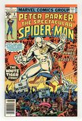 "Like a Tiger in the Night!" Part 1 of 2. First color comic appearance of the White Tiger. Script by Bill Mantlo. Art by Sal Buscema (breakdowns) and Mike Esposito (finishes). Cover by George Perez and Frank Giacoia. The Empire State University president is closing down the campus' night school, and the student body is very upset! The students want ESU to sell the prized Erskine Manuscripts to raise money. When the White Tiger apparently steals the manuscripts, tempers on campus reach a boiling point...and also set the White Tiger and the web-slinger on a collision course! Flashback cameos by Iron Fist, Jack of Hearts, Shang-Chi, the Prowler, and the Sons of the Tiger to recap the White Tiger's past adventures. (Notes: The White Tiger previously appeared in many issues of the black-and-white Deadly Hands of Kung Fu series. A 35-cent cover price variant exists for this issue.) 32 pages Cover price $0.30. Grade: VF 8.0 explanation of grade Condition: Used (collectible)