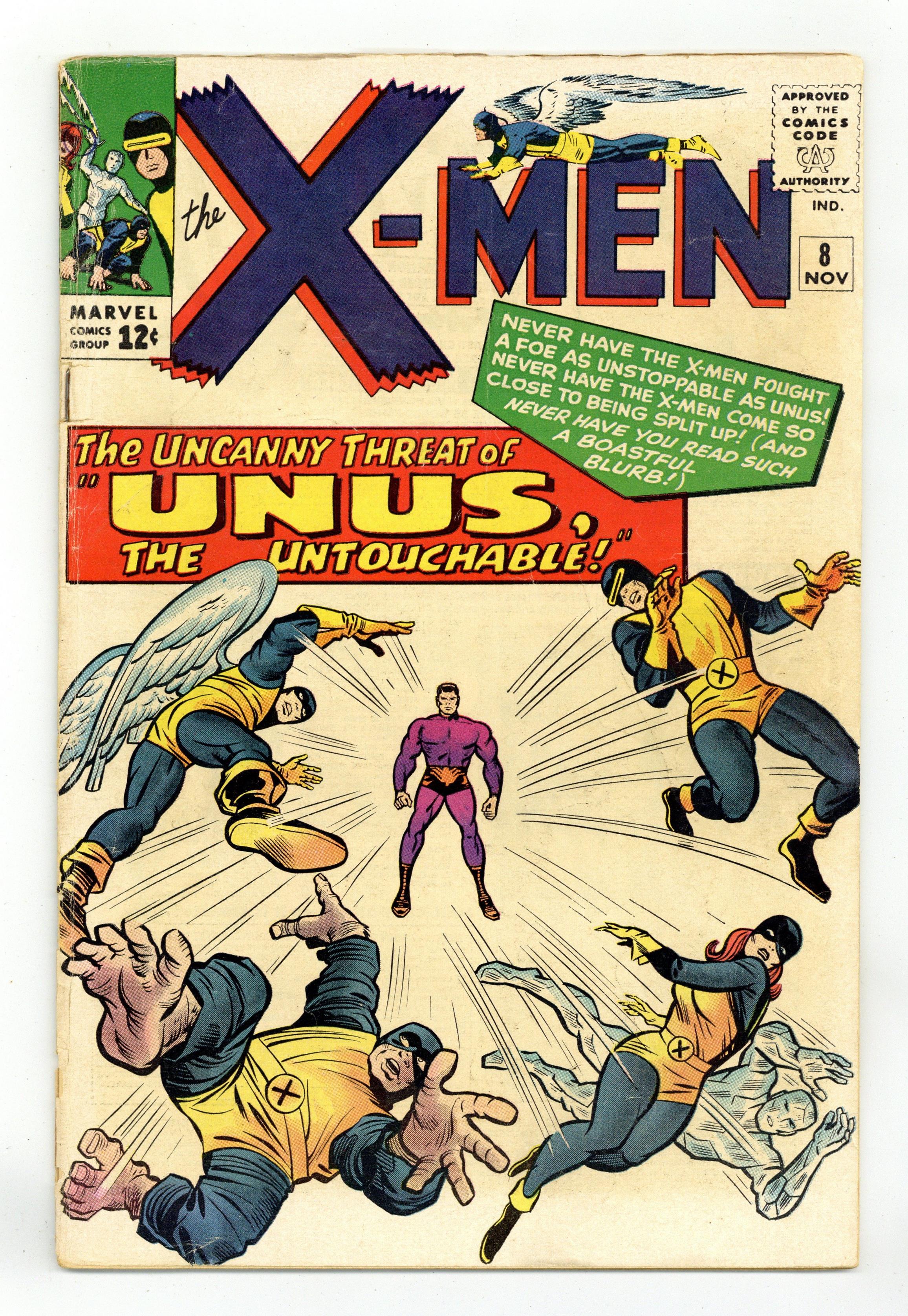 Cover pencils by Jack Kirby, inks by Chic Stone. Unus, the Untouchable!, script by Stan Lee, pencils by Jack Kirby, inks by Chic Stone; After being attacked by a mutant hating crowd following his heroic rescue of a young boy, Beast gets fed up with protecting a humanity that fears and hates him and quits the X-Men; He becomes a professional wrestler but meets his match when he battles Unus, a mutant who cannot be touched; Unus is trying to leave show biz and join Magneto's Brotherhood so he takes on the X-Men as an initiation; The X-Men barely fend him off and, returning home, they find the Beast has constructed a machine that will actually increase Unus' powers; Thinking him a traitor, the X-Men try to prevent Hank from using the machine, but, once Unus has been zapped and powered up, he finds that he cannot even eat without the food being repelled out of his hands; Beast returns him to his former power level but with the promise that Unus will steer clear of Magneto. The Beast Special Pin-Up Page, pencils by Jack Kirby, inks by Chic Stone. 36 pgs. $0.12. Cover price $0.12. Grade: GD+ 2.5 explanation of grade Condition: Used (collectible)
